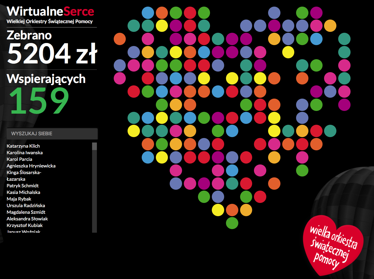 Już po raz trzeci szczeciński portal crowfundingowy www.Wspieram.to uruchomił Wirtualne Serce Wielkiej Orkiestry Świątecznej Pomocy. Każdy może stać się częścią wielkiego Wirtualnego Serca w zamian za wpłatę do "wirtualnej puszki". Z każdą wpłatą Serce będzie rosnąć. Do tej pory za pomocą Wirtualnych Serc szczecińska firma zgromadziła ponad 120 tysięcy złotych od niemal 4000 wspierających!