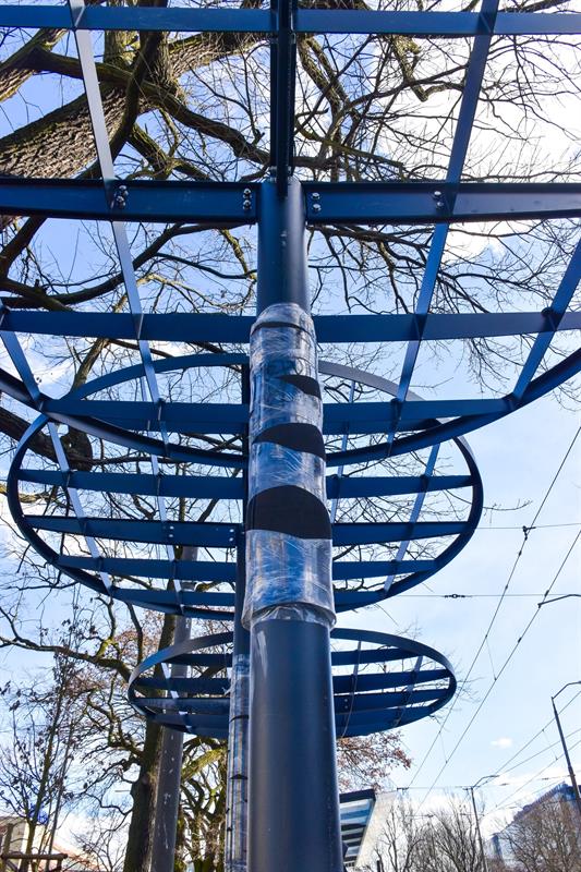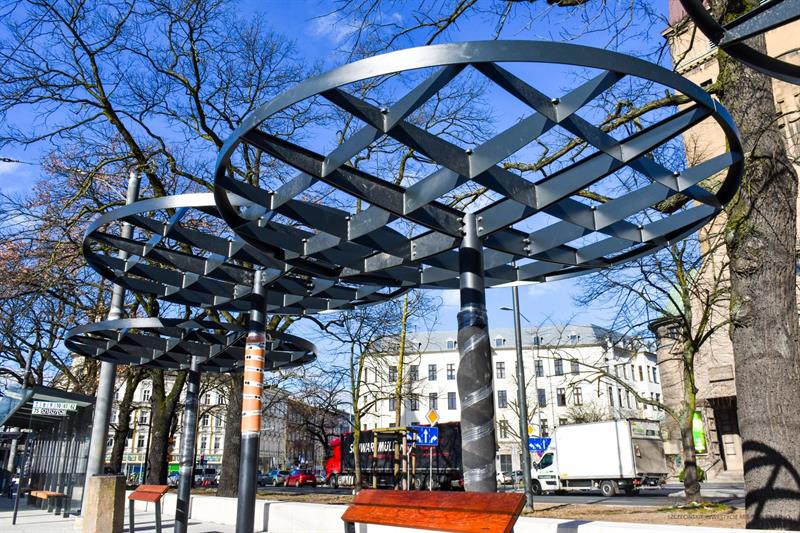 Kratownice na obrysie okręgów, zamontowane na stalowych słupach, które ustawiono w obrębie nowego przystanku tramwajowego, w bliskości kościoła garnizonowego. Już teraz wyglądają intrygująco. Jednak pełny efekt uzyskają dopiero po okryciu roślinami.