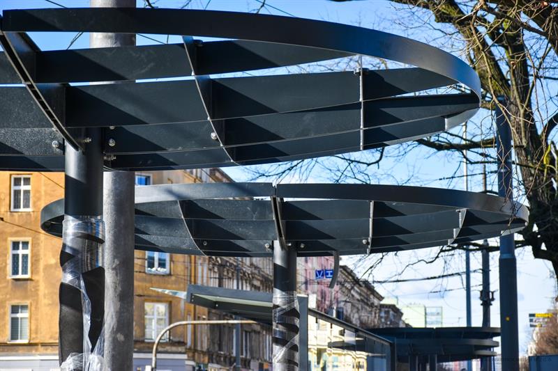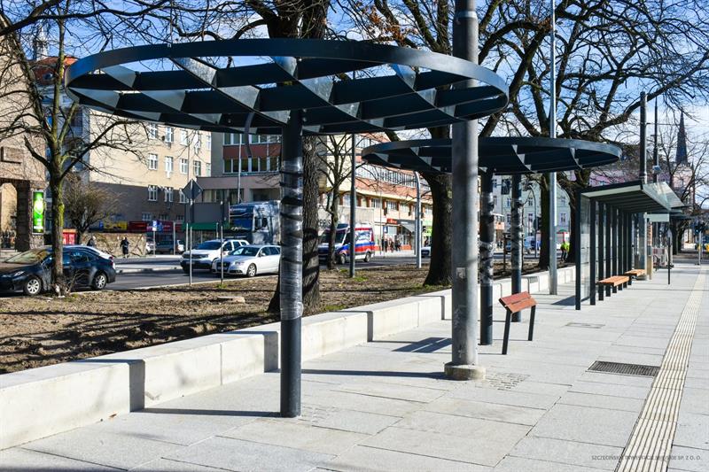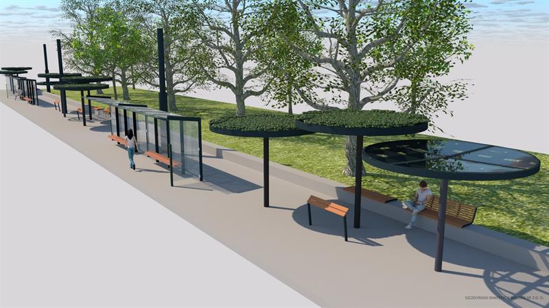 Oryginalne tzw. zielone parasole, czyli oryginalne wiaty nowego przystanku na pl. Zwycięstwa – ich walor estetyczny łączyć się będzie z praktycznym. Fot. Szczecińskie Inwestycje Miejskie