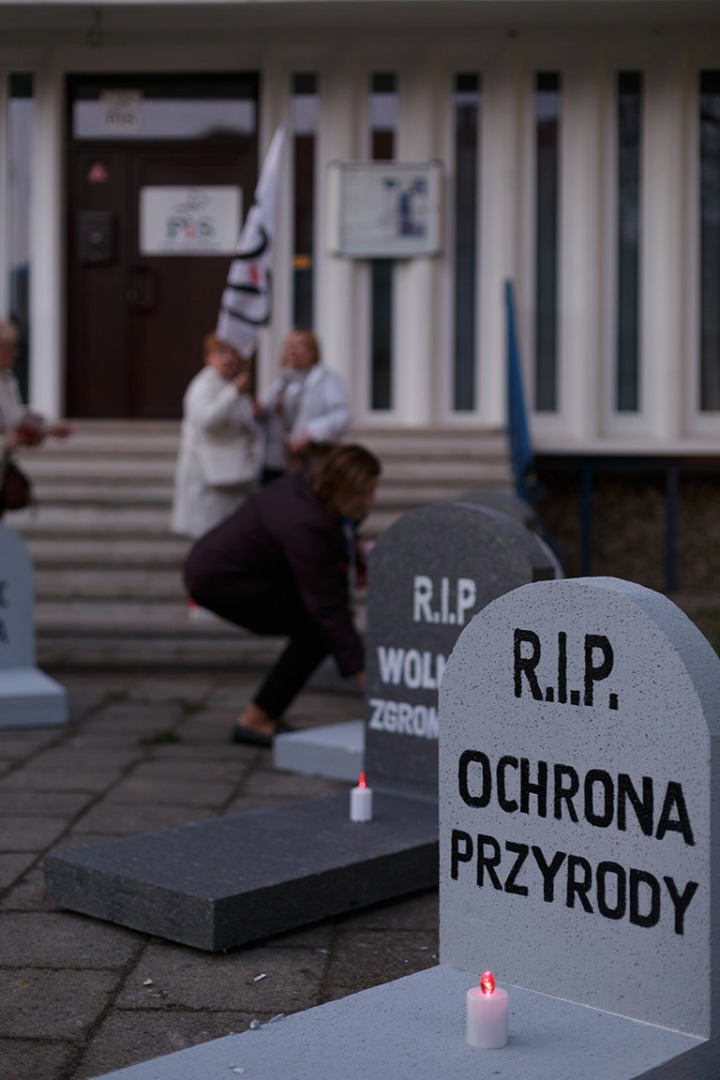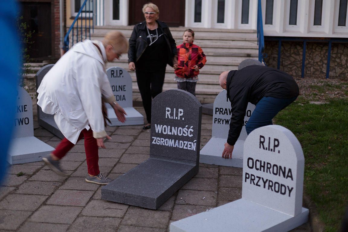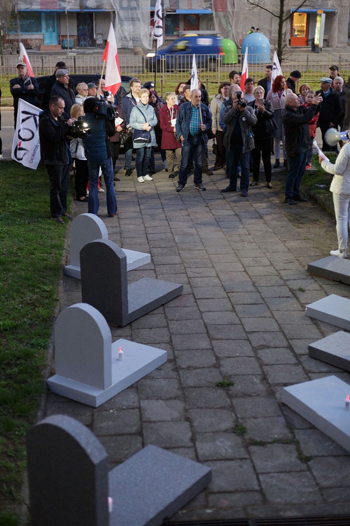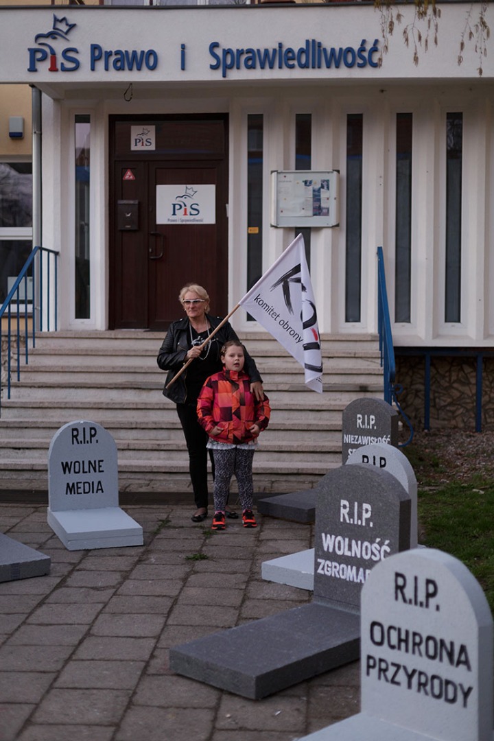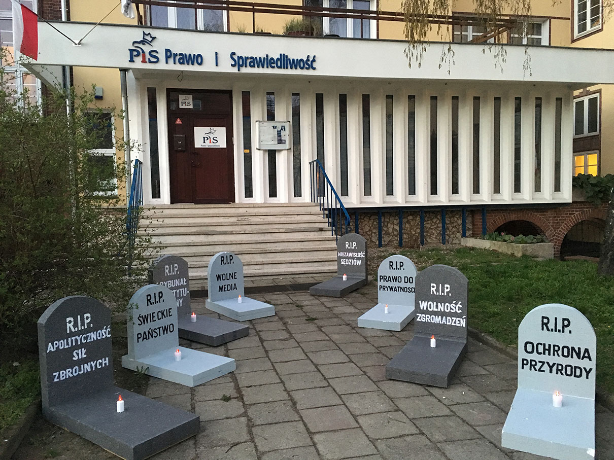 Z „Apelem poległych wartości” i... ośmioma mogiłami przyszli w niedzielę pod siedzibę szczecińskiego Prawa i Sprawiedliwości działacze Komitetu Obrony Demokracji.