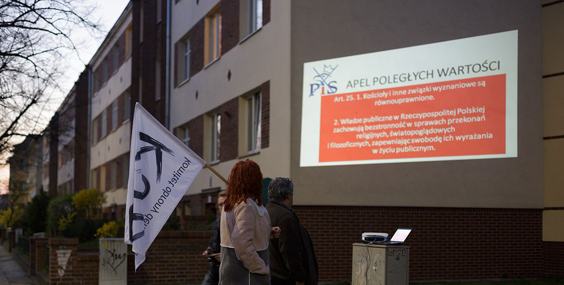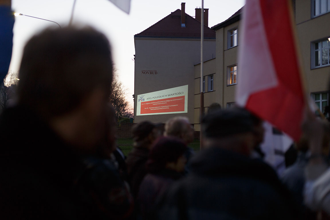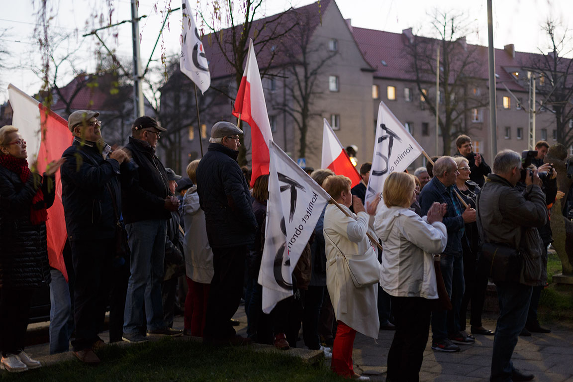 Zebrali się na ulicy Mickiewicza 69, by o g. 20 właśnie pod biurem PiS zaprotestować przeciwko polityce obecnego rządu. KOD uważa, że w ostatnich miesiącach "jesteśmy świadkami kwestionowania najważniejszych wartości oraz deptania naszych praw i wolności przez najwyższe władze państwowe”. Akcję zorganizowali w 20. rocznicę uchwalenia Konstytucji RP.