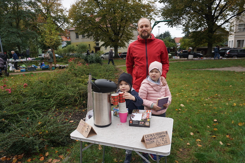 Rodzice Jasia (lat 5) i Basi (lat 7) uczą dzieci podstaw biznesu. Na ich stoliku postawiono termos i jednorazowe kubki, a odręczny napis na kartonie informuje, ze można u nich nabyć ciepłą herbatę malinową z miodem.