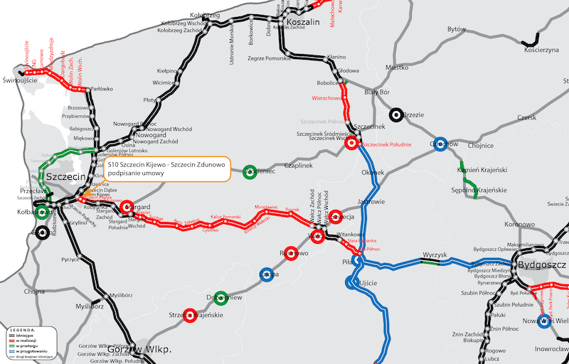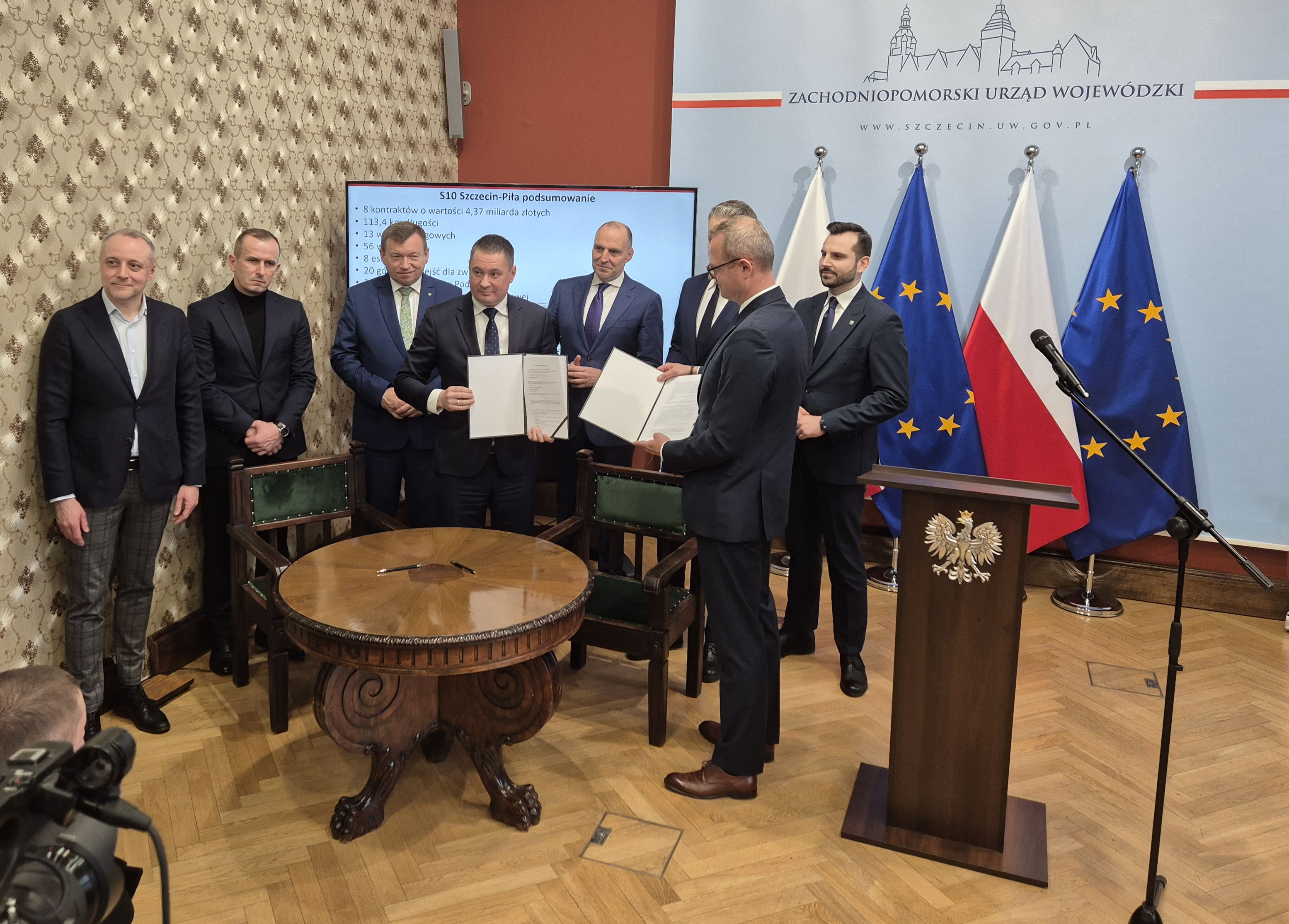 W poniedziałek (27 stycznia) w Zachodniopomorskim Urzędzie Wojewódzkim w Szczecinie podpisano umowę dotyczącą realizacji drogi ekspresowej S10 Szczecin-Piła na odcinku Szczecin Kijewo-Szczecin Zdunowo. To odcinek długości 4,4 kilometra. Wykonawca ma go zrealizować do 2028 roku.