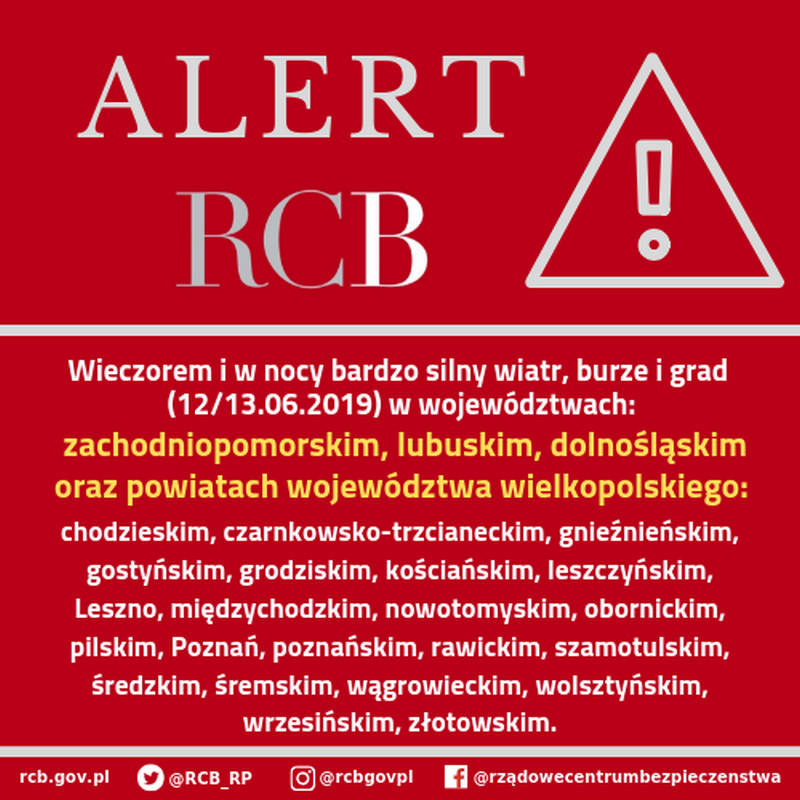 Ostrzeżenie obejmuje teren całego województwa i obowiązuje od godz. 19 w środę (12 czerwca) do godz. 6 w czwartek. Stopień zagrożenia został oceniony na drugi w skali 3-stopniowej.