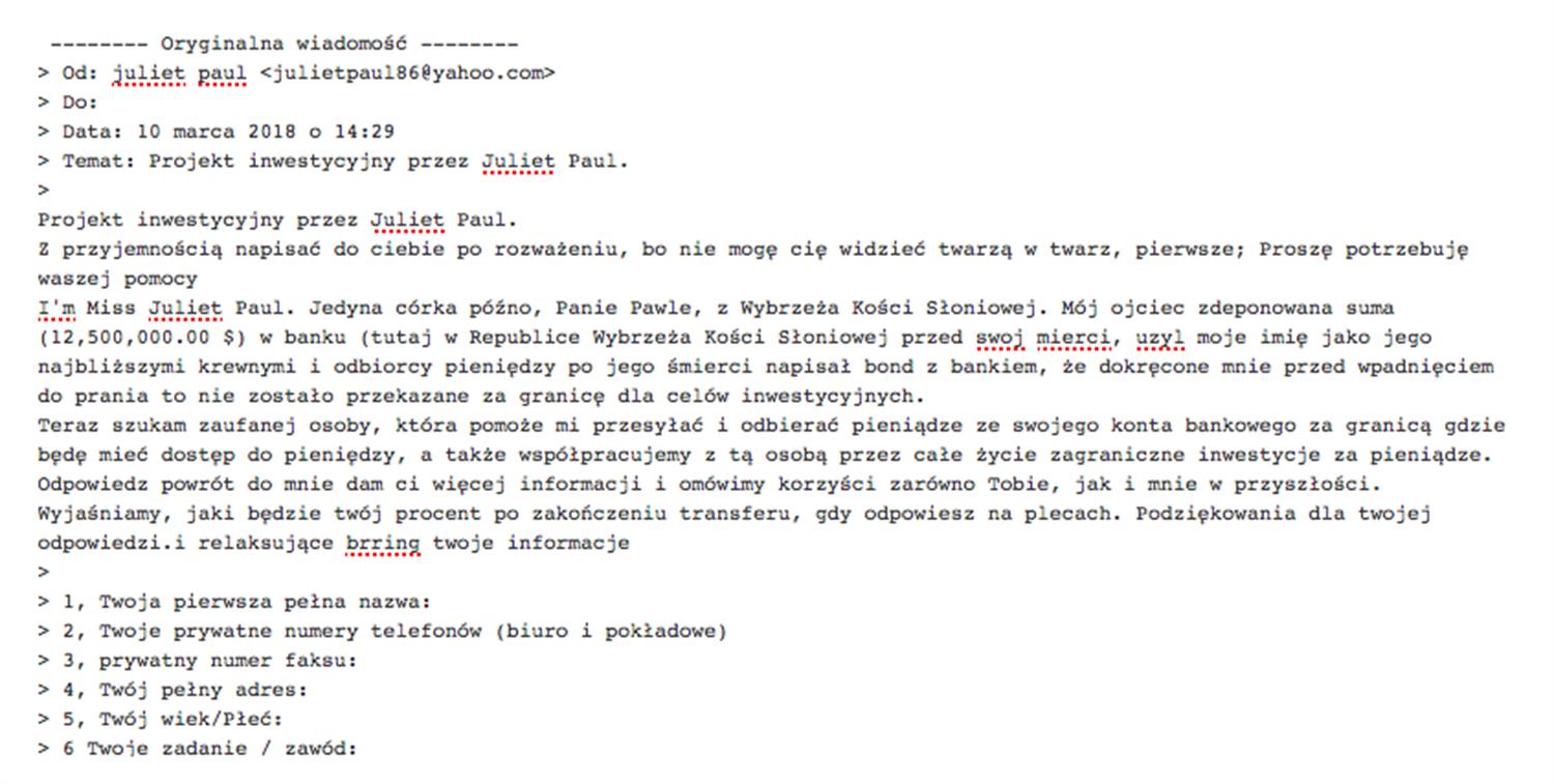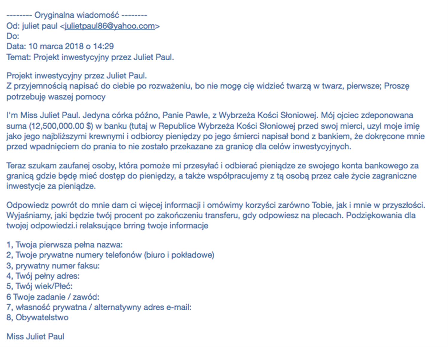 „I’m Miss Juliet Paul. Jedyna córka późno, Panie Pawle, z Wybrzeża Kości Słoniowej. Mój ojciec zdeponowana suma (12,500,000.00 $) w banku (tutaj w Republice Wybrzeża Kości Słoniowej przed swoj mierci, uzyl moje imię jako jego najbliższymi krewnymi i odbiorcy pieniędzy po jego śmierci napisał bond z bankiem, że dokręcone mnie przed wpadnięciem do prania to nie zostało przekazane za granicę dla celów inwestycyjnych”.