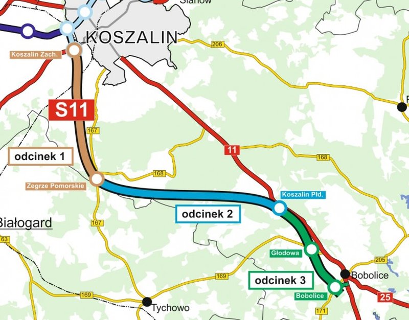 Fragment S11 od Koszalina do Bobolic będzie miał 47,7 km długości. Został podzielony na trzy odcinki realizacyjne: Koszalin – Zegrze Pomorskie (16,8 km), Zegrze Pomorskie – Kłanino (19,28 km) i Kłanino – Bobolice (11,6 km). 1 marca na zaprojektowanie i budowę każdego z nich ogłoszone zostały przetargi. Pierwotny termin składania ofert został wyznaczony na 9 kwietnia, ale ze względu na liczne pytania zainteresowanych oferentów (łącznie złożono ich ponad 2600 – PAP), termin przedłużany był kilkakrotnie.