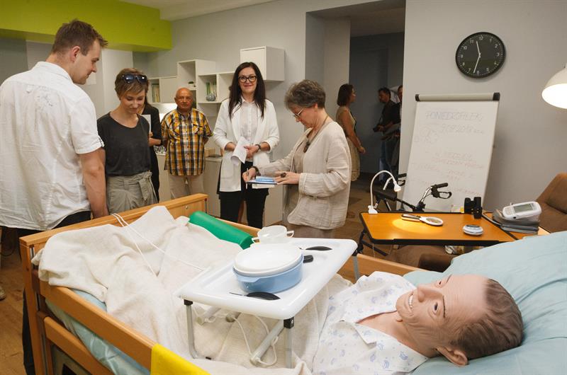 Zastosowano również kontrastujące kolory ścian oraz zaznaczono taśmą ostrzegawczą wszelkie niebezpieczne dla osób z wadą wzroku miejsca. W centralnym miejscu pokoju umieszczono specjalistyczne łóżko rehabilitacyjne. Jest ono dostępne z obydwu stron oraz wyposażone w materac przeciwodleżynowy. W łóżku umieszczony jest manekin osoby starszej, na którym można się uczyć podawania insuliny, pomiaru cukru czy pielęgnacji odleżyn. W mieszkaniu modelowym regularnie odbywają się szkolenia dla opiekunów osób niepełnosprawnych.