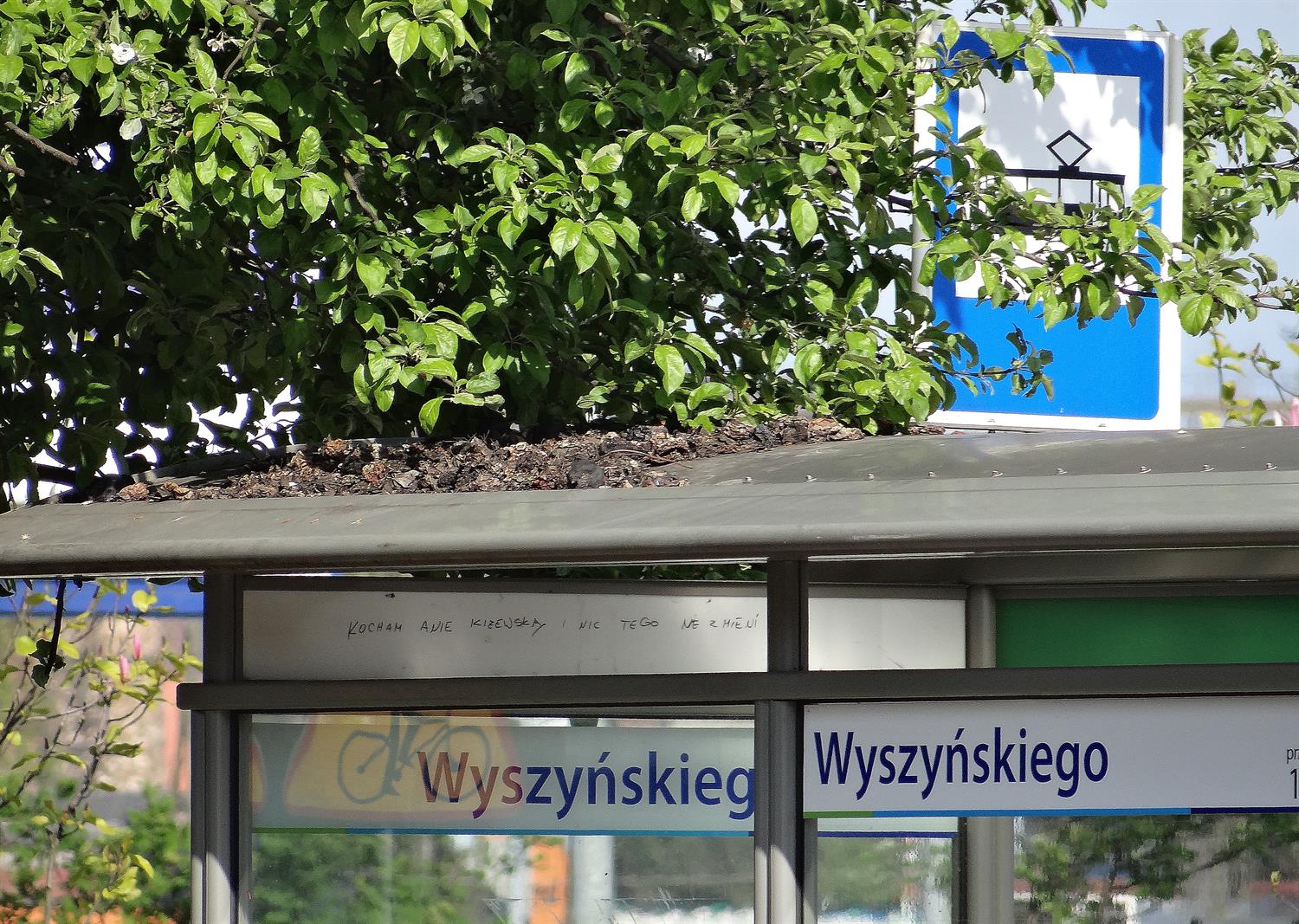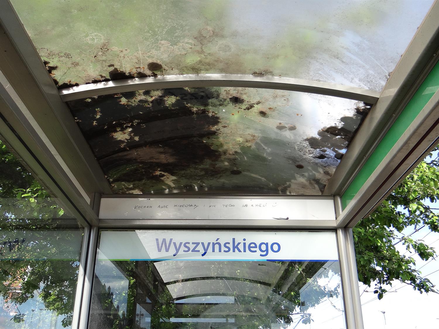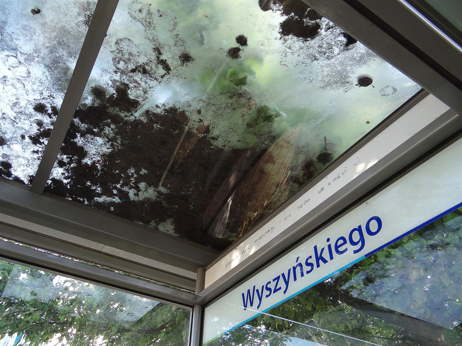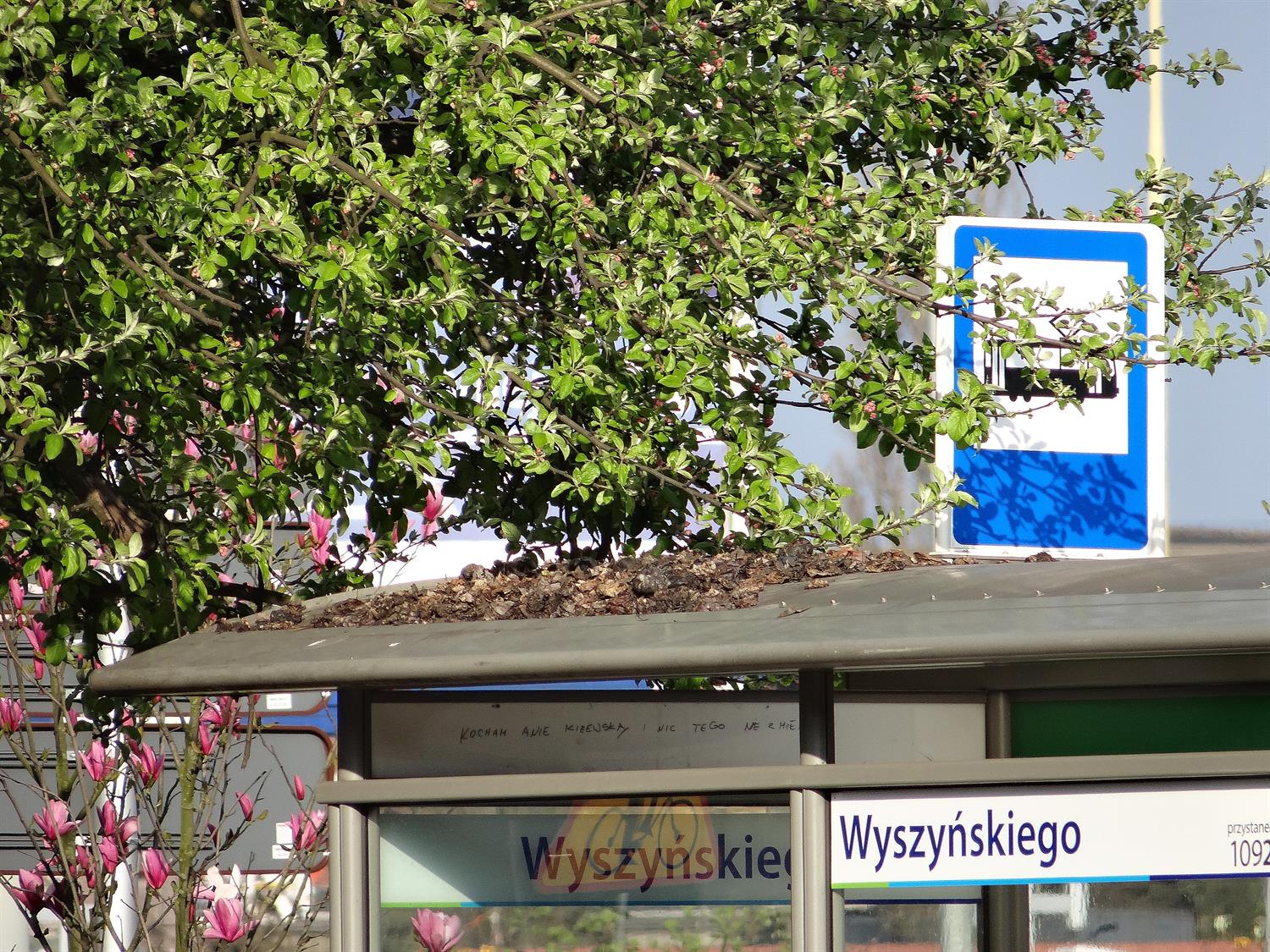 Świeża, soczysta zieleń, w pobliżu magnolie, a na daszku jednej z wiat przystankowych owoce, a właściwie to, co z jabłek, które minionej jesieni opadły z pobliskiego drzewa. Słowem zgnilizna i syf nad pasażerów głowami na przystanku tramwajów linii 6. Czas by to uprzątnąć. ©℗