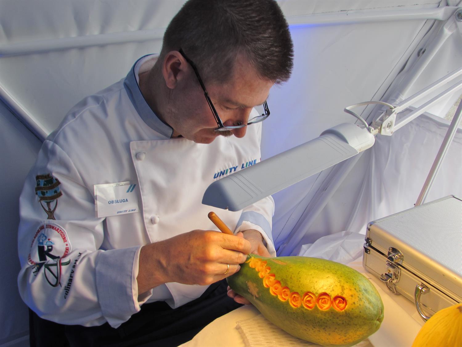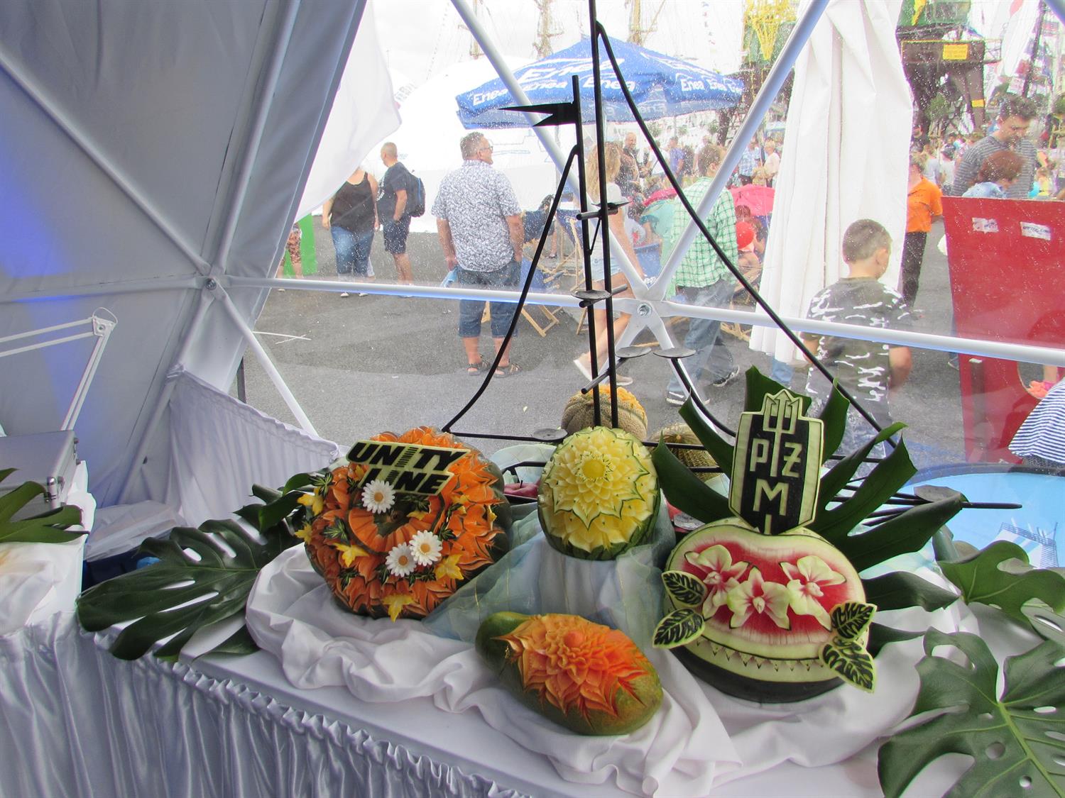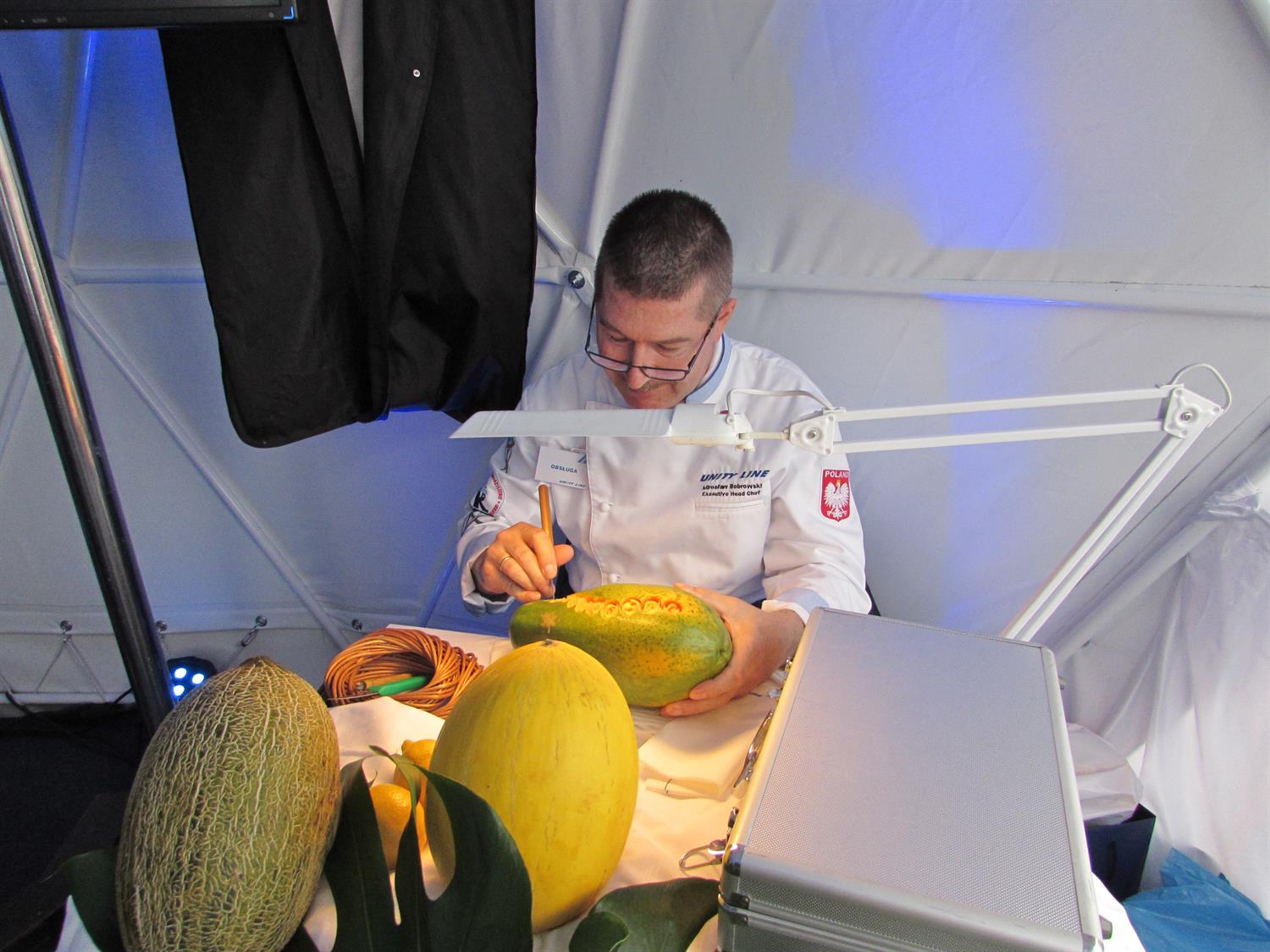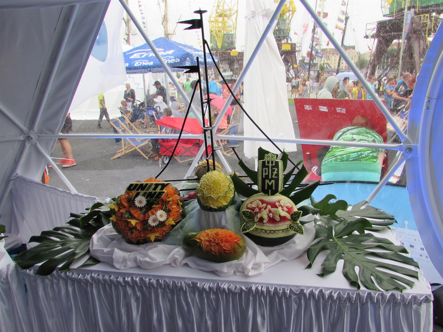 W namiocie sferycznym Unity Line na Łasztowni można m.in. podziwiać (jeszcze w poniedziałek do godz. 15) kunszt Mirosława Bobrowskiego, szefa kuchni na promie „Polonia”. Pan Mirosław jest mistrzem carvingu, czyli sztuki rzeźbienia w owocach.