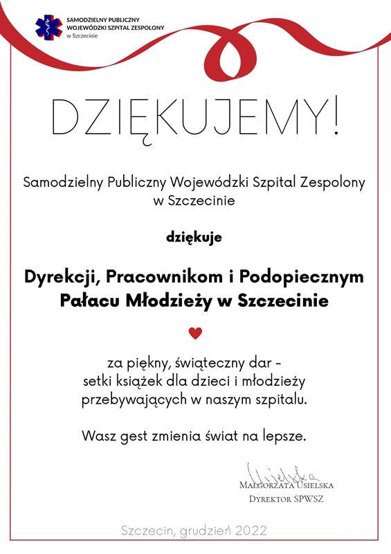 W Pałacu Młodzieży powstał pomysł, by we wnętrzach oddziału dziecięcego szpitala wojewódzkiego przy ul. Arkońskiej w Szczecinie powiesić prace swoich podopiecznych. Miała być tylko wystawa, ale na niej się nie skończyło – do małych pacjentów trafiły setki książek, kolorowanek, komiksów…