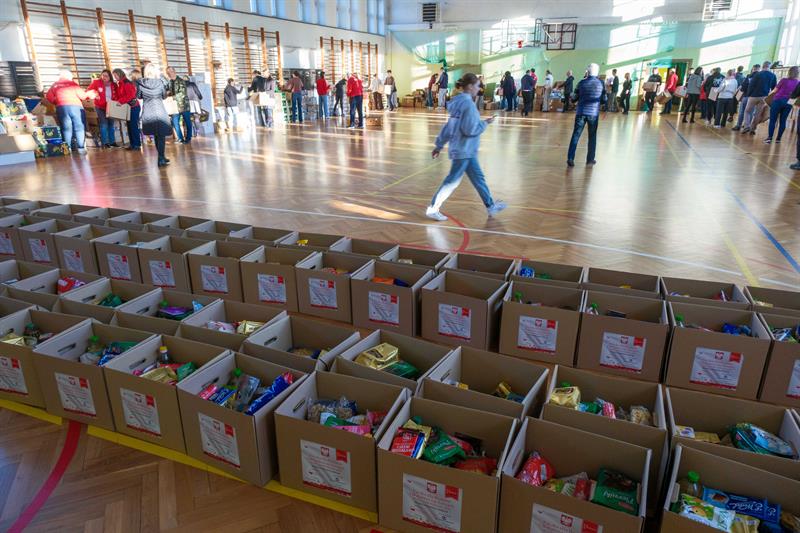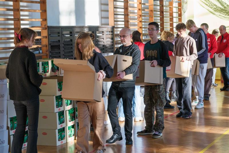 W paczkach znalazły się m.in. konserwy mięsne, kawa, herbata, olej, środki czystości oraz przybory dla dzieci.