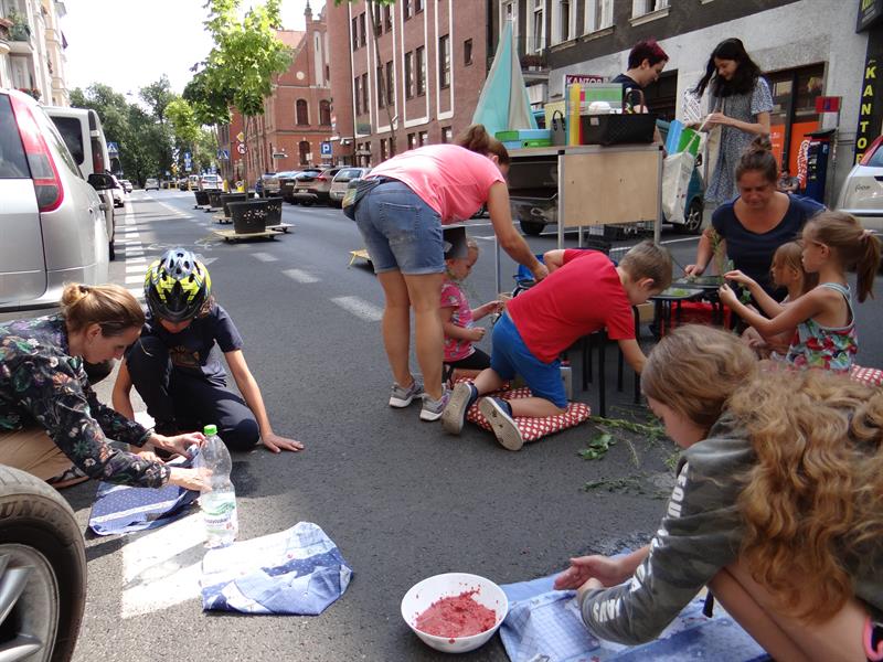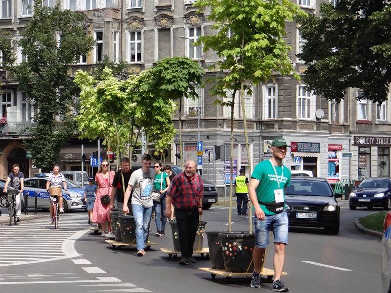 „Wędrujące drzewa" - klony w kontenerach - od dwóch lat za sprawą aktywistów i sympatyków Szczecińskiego Ruchu Miejskiego docierają w newralgiczne miejsca szczecińskiej betonozy i do kolejnych miejskich „wysp ciepła" - symbolicznie oswajając ich odhumanizowaną przestrzeń w bardziej przyjazną, zieloną. Tym razem - w sobotę (7 sierpnia) - dotarły na ul. Jagiellońską, gdzie na odcinku pomiędzy Śląską a św. Wojciecha odbywało się barwne i dynamiczne Święto Ulicy.