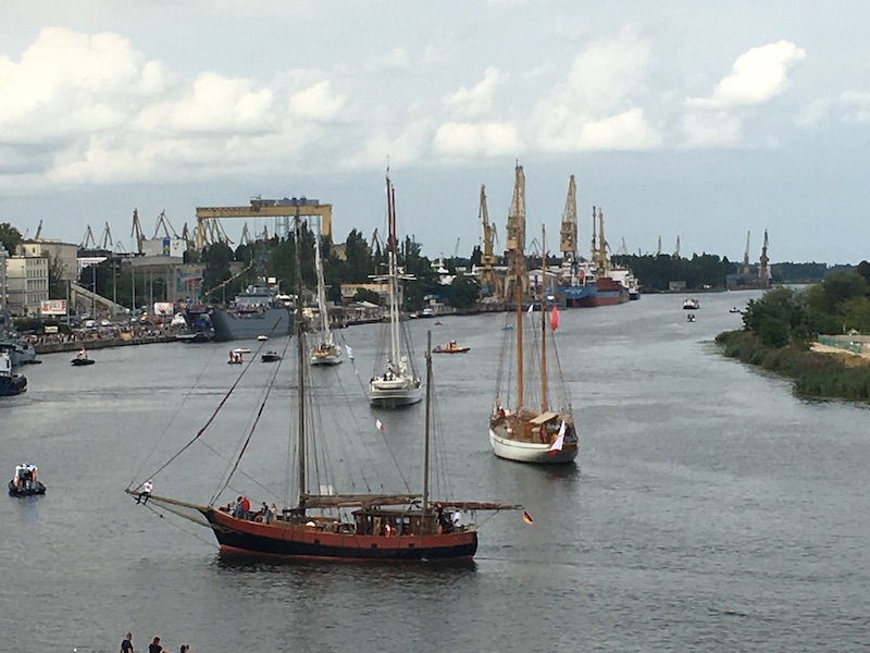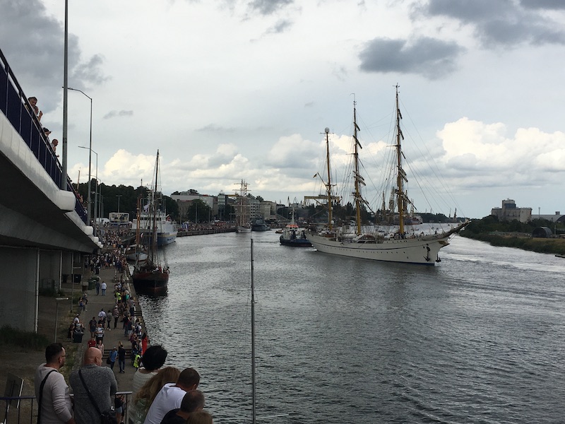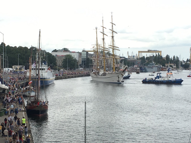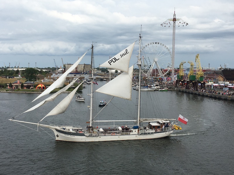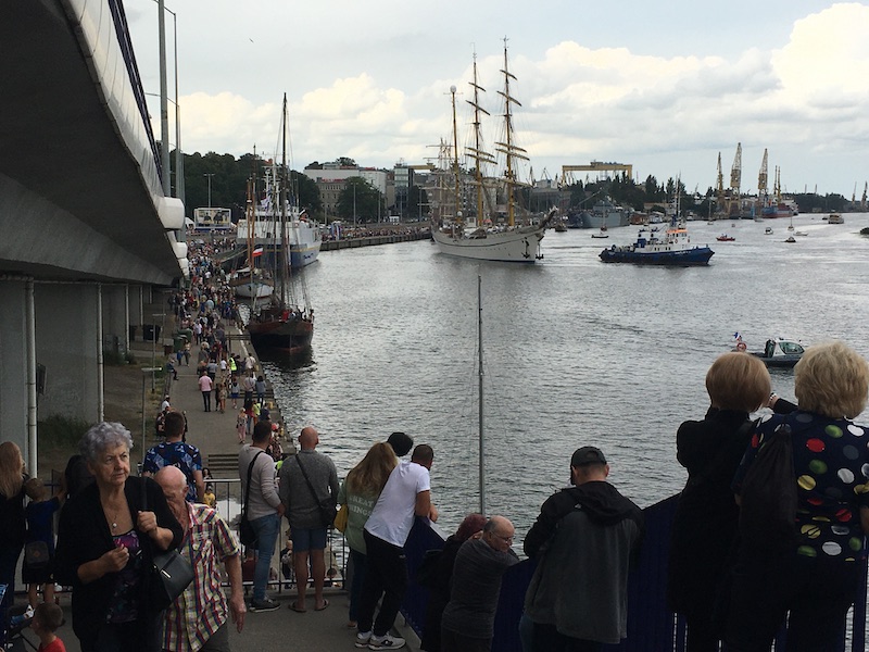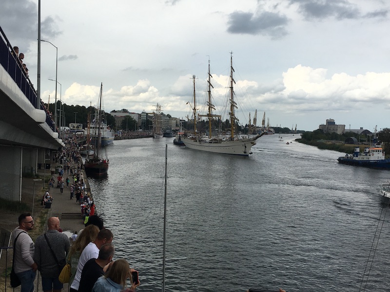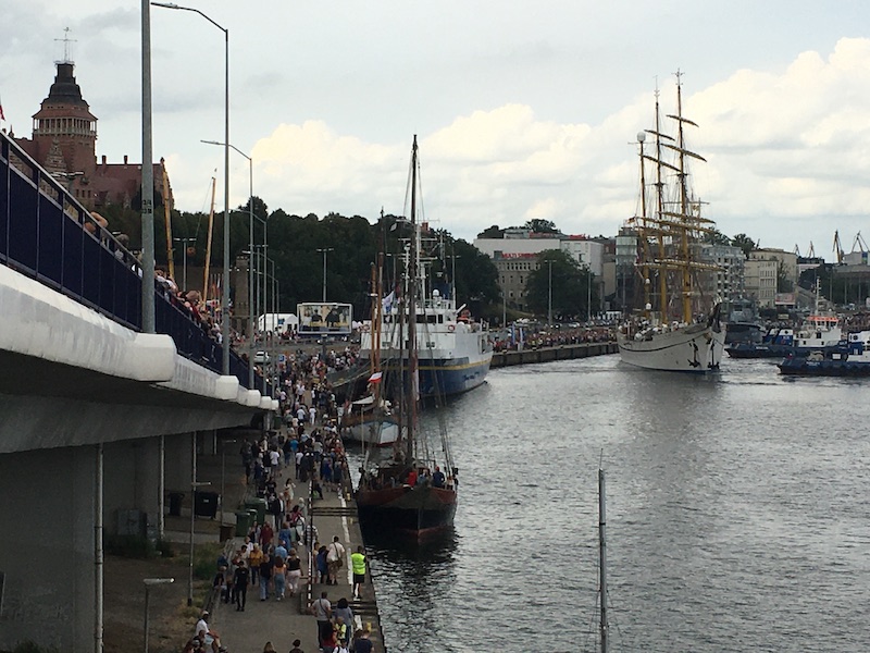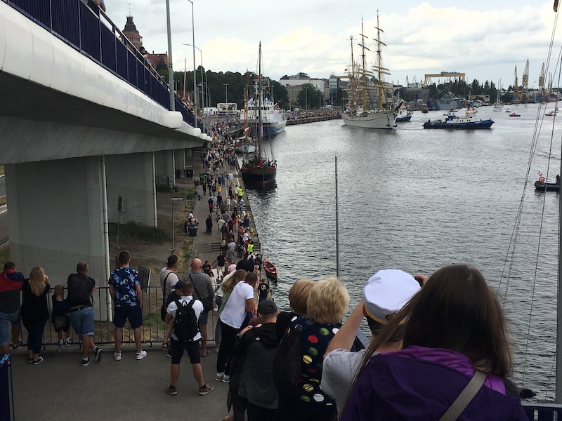 Chociaż impreza Żagle 2002 jeszcze potrwa do północy, to pierwsze z jachtów, które pojawiły się przy nabrzeżu pasażerskim u stóp szczecińskich Wałów Chrobrego, zrzuciły już cumy i odpłynęły, obierają kurs na jezioro Dąbie albo na Zalew Szczeciński. Na sam finał pobytu załogi większości jednostek w paradnym szyku wykonały rundę honorową, opływając Wyspę Grodzką, którą oblewają wody Odry Zachodniej i jej przesmyku Duńczycy od strony Łasztowni. W paradzie wzięły udział tylko jedno i dwumasztowce. W sumie dziewięć. Na czas parady podniesione zostało środkowe przęsło mostu między wyspami Grodzką i Łasztownią na wysokości mariny. Następnie większość z nich opuściła Szczecin. Jedyne dwa trójmasztowce Gorch Fock i ORP Iskra pozostały przy nabrzeżu pasażerskim, na lewym brzegu Odry. Ten pierwszy odbija właśnie o kei w asyście dwóch holowników.