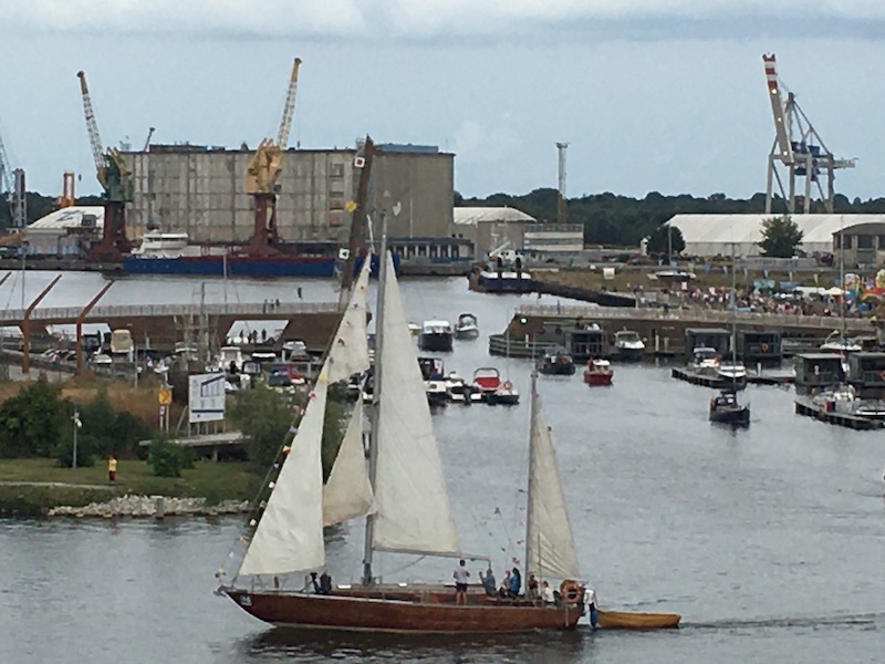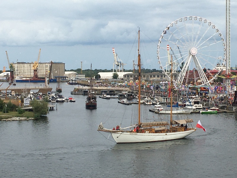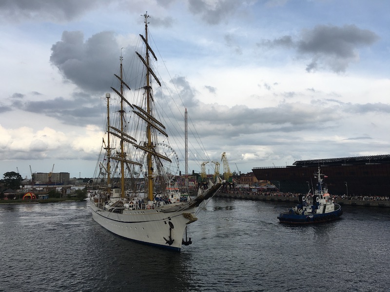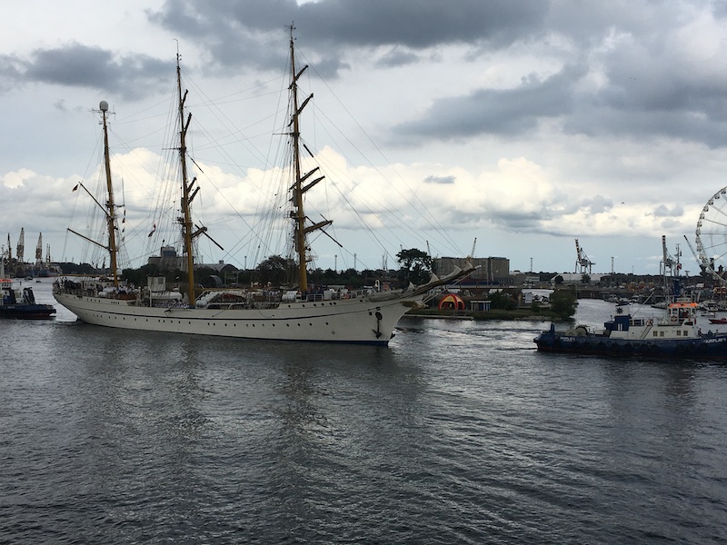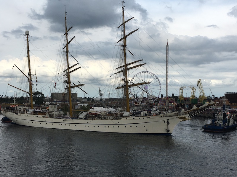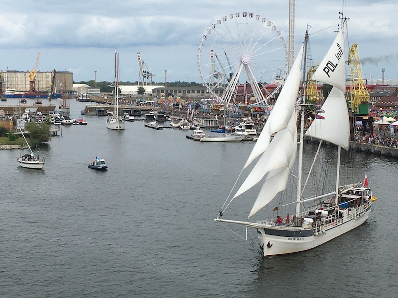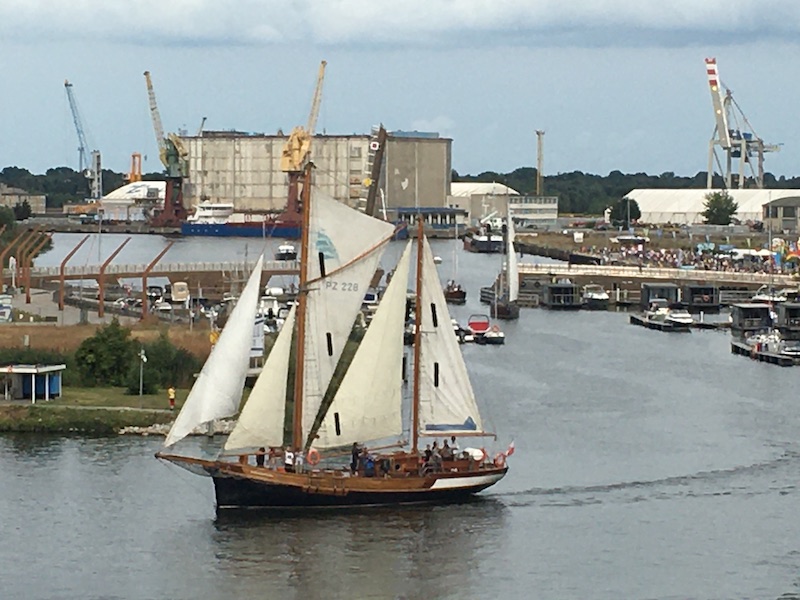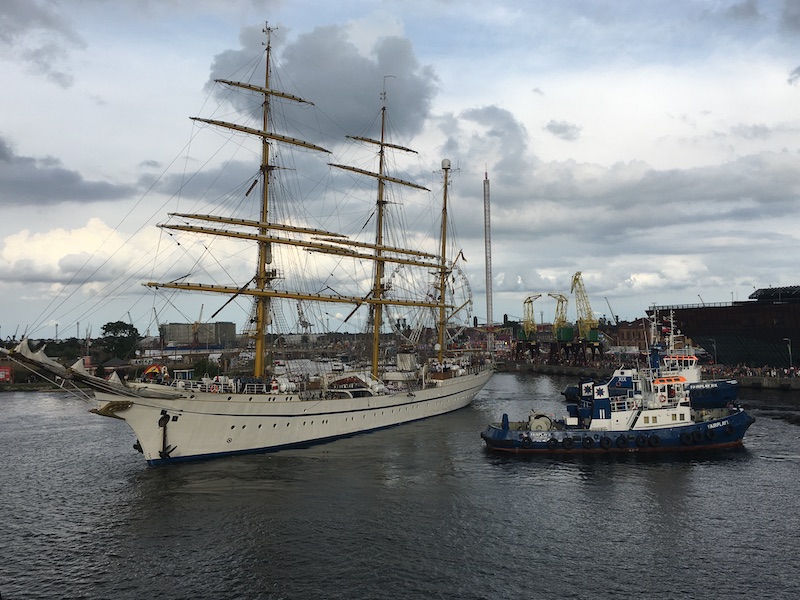 Chociaż impreza Żagle 2002 jeszcze potrwa do północy, to pierwsze z jachtów, które pojawiły się przy nabrzeżu pasażerskim u stóp szczecińskich Wałów Chrobrego, zrzuciły już cumy i odpłynęły, obierają kurs na jezioro Dąbie albo na Zalew Szczeciński. Na sam finał pobytu załogi większości jednostek w paradnym szyku wykonały rundę honorową, opływając Wyspę Grodzką, którą oblewają wody Odry Zachodniej i jej przesmyku Duńczycy od strony Łasztowni. W paradzie wzięły udział tylko jedno i dwumasztowce. W sumie dziewięć. Na czas parady podniesione zostało środkowe przęsło mostu między wyspami Grodzką i Łasztownią na wysokości mariny. Następnie większość z nich opuściła Szczecin. Jedyne dwa trójmasztowce Gorch Fock i ORP Iskra pozostały przy nabrzeżu pasażerskim, na lewym brzegu Odry. Ten pierwszy odbija właśnie o kei w asyście dwóch holowników.