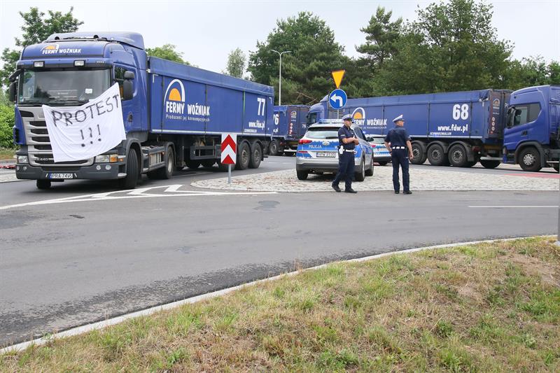 Na rondzie stanowiącym główny węzeł wlotowy drogi wiodącej do wspomnianych obiektów, ustawione zostały wielkie ciężarówki z widniejącymi na burtach reklamami przedsiębiorstwa „Fermy Woźniak”. Wewnątrz pojazdów nie było kierowców. Szybko okazało się, że blokada drogi to znak protestu przeciwko zakazowi wjazdu ciężkiego sprzętu na teren dawnego ośrodka Proton, gdzie ma powstać duży nowoczesny obiekt noclegowy. Ciężarówki zostały ustawione ze skręconymi kołami przednimi i z zablokowanymi hamulcami po to, aby trudniej było je odholować.