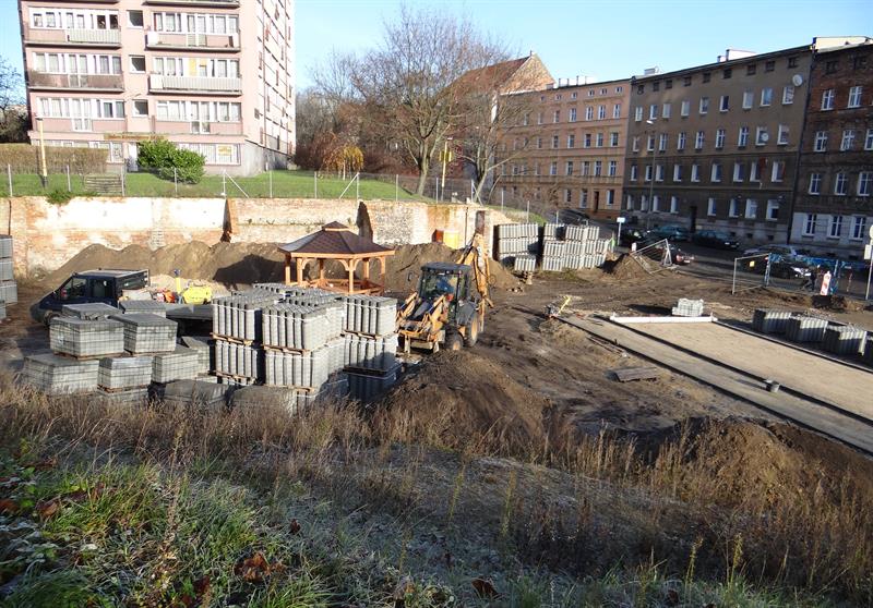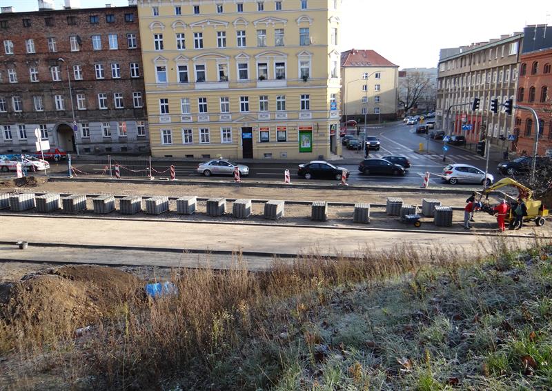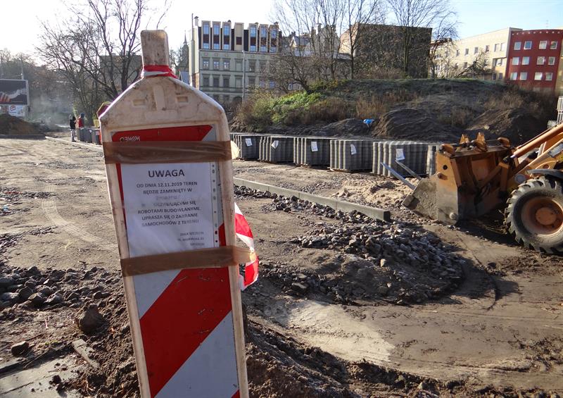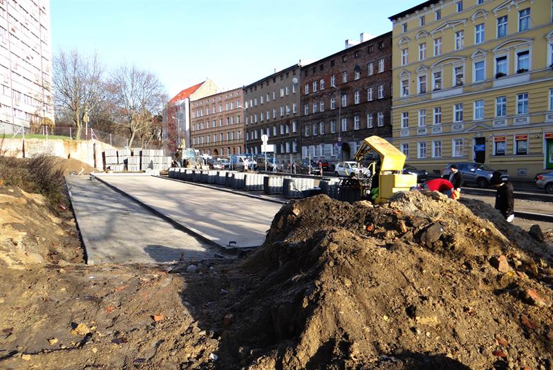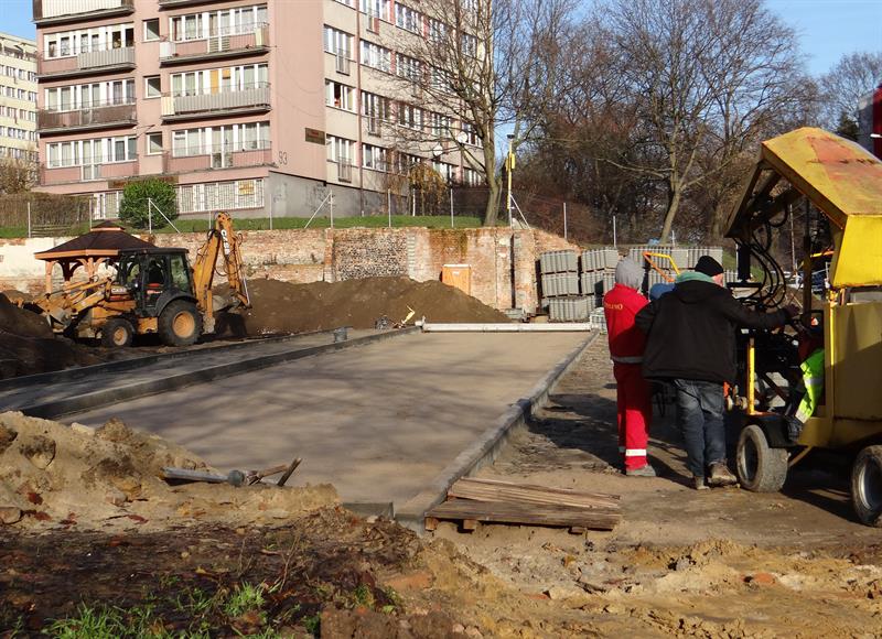 Na placu po wyburzonych kamienicach komunalnych przy skrzyżowaniu ulic Krasińskiego i Niemierzyńskiej na zlecenie administratora tego terenu miejskiego, którym jest Zarząd Budynków i Lokali Komunalnych, trwają prace przy urządzaniu nowego parkingu z nawierzchnią z płyt ażurowych.