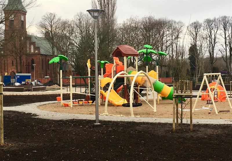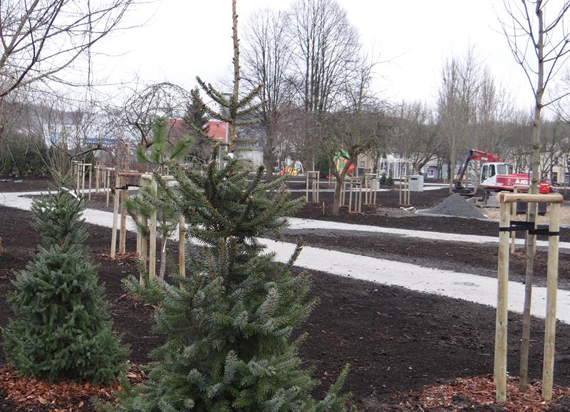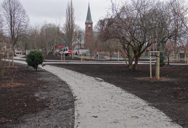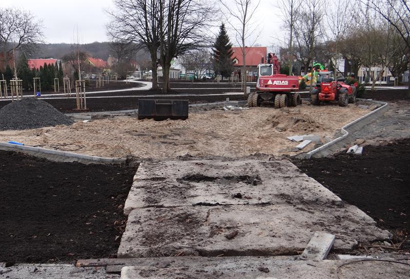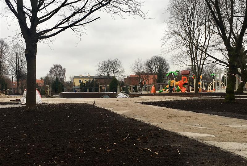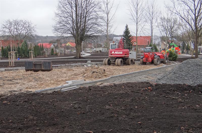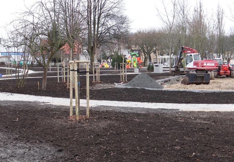 Trwają teraz prace związane z utwardzeniem nawierzchni głównego placu - wokół fontanny. Zamontowano także oświetlenie parkowe. Pojawiły się nasadzenia. To w sumie 129 drzew (34 iglaste i 95 liściastych) oraz sześćset krzewów ozdobnych różnych odmian. Powierzchnie przyszłych trawników w większości zostały przygotowane do obsiania trawą. Zainstalowane teraz będą elementy małej architektury.