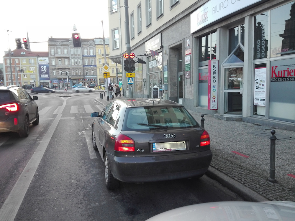 W środę ok. godz.15 na światłach przed wejściem do naszej redakcji zatrzymała się pani w audi na goleniowskiej rejestracji. Włączyła światła awaryjne i czekała na koleżankę, która weszła do budynku redakcji (mieszczą się w nim także m.in. wydziały Urzędu Marszałkowskiego).