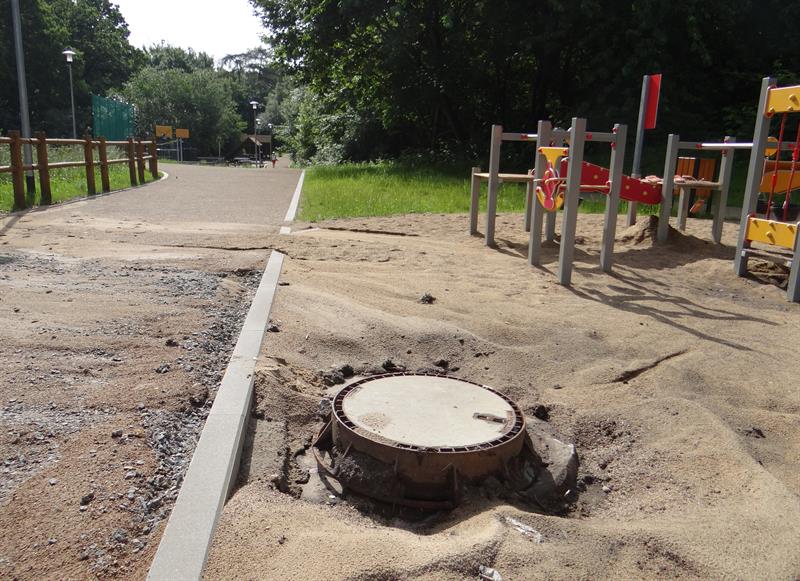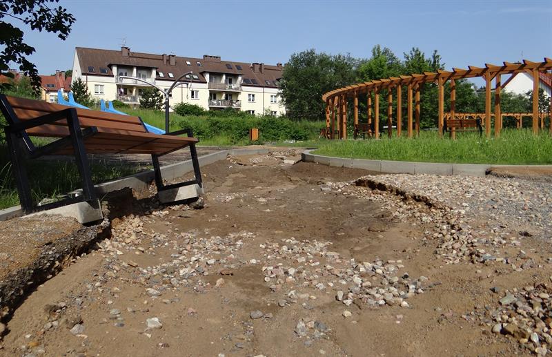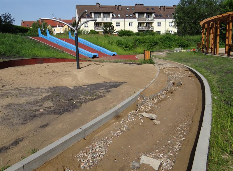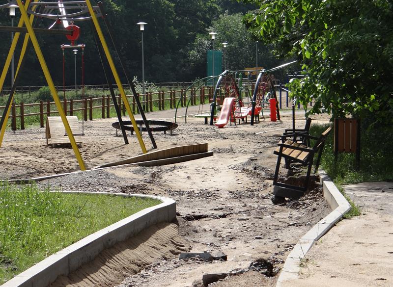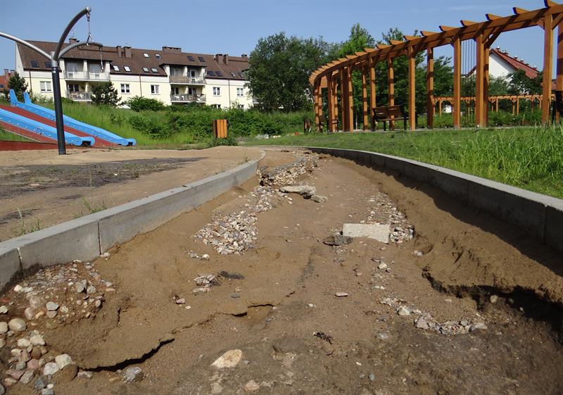 Sensoryczny ogród zabaw, strefa sportu i rekreacji urządzone na obrzeżach Parku Brodowskiego między ulicami Żurawią i Teodora Axentowicza na Żelechowej w Szczecinie. Na tę inwestycję, zakończoną ledwie pół roku temu, z budżetu miasta wydanych zostało około 2,5 mln złotych. Wygląda dziś tak, że nadaje się już do kapitalnej naprawy. Po ostatnich ulewach zamieniły się w strefę zniszczeń.
