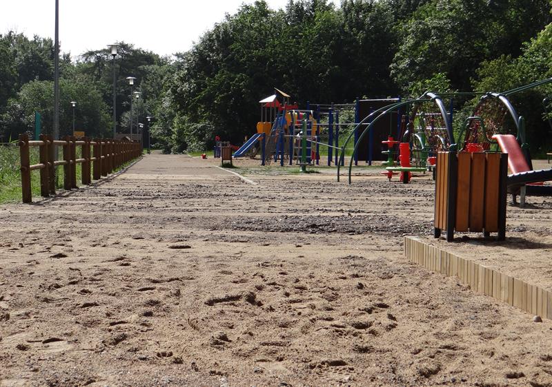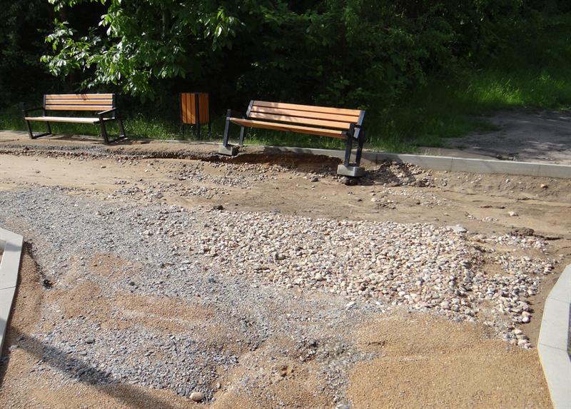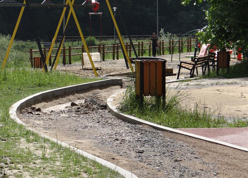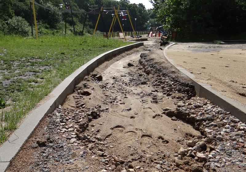 Spore fragmenty urządzonych tam alejek spacerowych o nawierzchni mineralnej, utwardzonej, dosłownie spłynęły z deszczówką. Żwir zmieszany z piachem niesiony przez potoki spływającej wody zalega na całej szerokości niektórych z nich. A część budulca wylądowała już w chaszczach na stokach skarpy, poniżej której znajduje się zbiornik wodny.