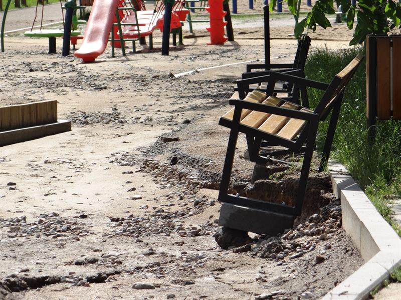 Odkryte zostały studzienki. Szusującym strugom deszczówki wzdłuż alejek nie były w stanie też oprzeć się niektóre z ławek mocowane na betonowych bloczkach w ich utwardzanej nawierzchni, a wyglądającej na solidnie wykonaną. Jak się okazało - tylko z pozoru. ©℗