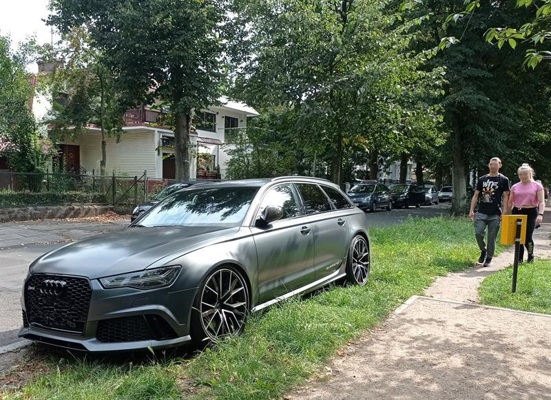Gdy wszyscy parkują na jezdni, on stanął na trawie. Niszcząc fragment zieleni starego Pogodna - przy ul. Brodzińskiego. Dając dowód tego, że nawet największym samochodem może kierować bardzo, bardzo mały człowiek.