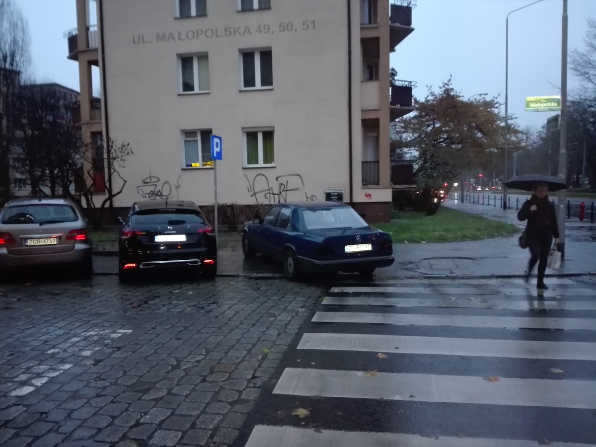 Jeżeli zaparkujemy poza strefą, ale w miejscu do tego nieprzeznaczonym, to nie musimy płacić za parkowanie. Widocznie z tego założenia wyszedł właściciel tego mercedesa, który kilka dni temu zaparkował swoje auto przed znakiem oznajmującym początek SPP na skrzyżowaniu ulic Matejki i Małopolskiej w Szczecinie. Tyle tylko, że zaparkował na przejściu dla pieszych, czego odpowiednie służby jakoś nie dostrzegają.