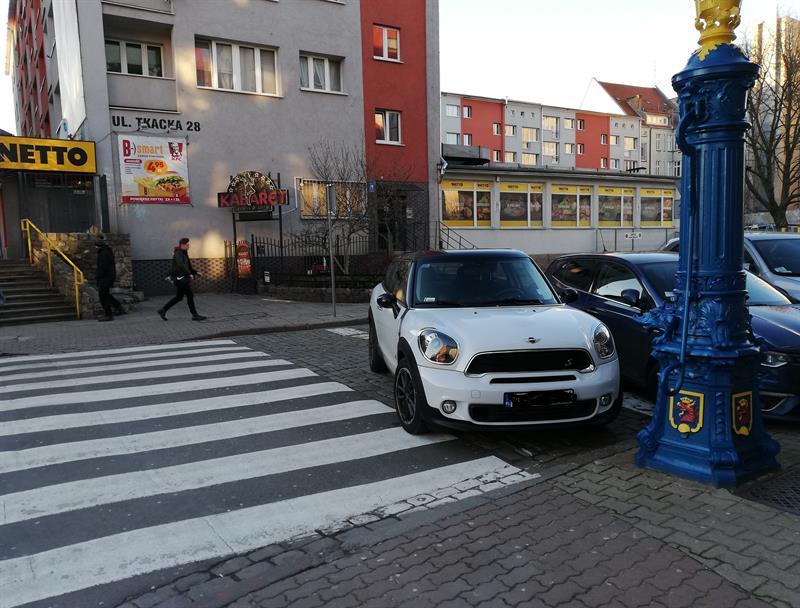 Samochód nie stoi w odległości bezpiecznej od przejścia dla pieszych - przerywaną linią wyraźnie oznaczonej na jezdni. Parkuje wprost na „zebrze". Taki szacunek dla prawa okazują kierowcy na ul. Tkackiej: niejako na tyłach Bramy Portowej, a tuż przy skrzyżowaniu z ul. Grodzką. Jak widać, skutecznie umykając uwadze zarówno straży miejskiej, jak i policji.