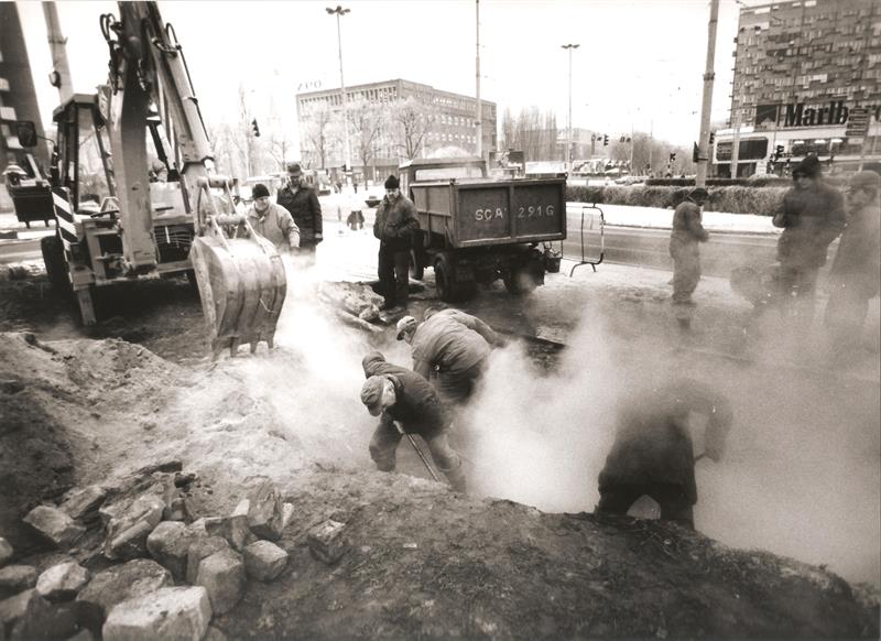 Na naszym zdjęciu z roku 1993 widać ekipę usuwającą awarię pękniętej rury. Widać też kłęby buchającej spod ziemi pary. Takie sytuacje nie dziwiły w mieście. Nie były może zbyt powszechne, ale na pewno też nie należały do rzadkości.