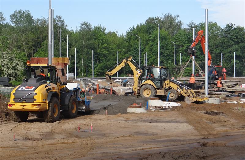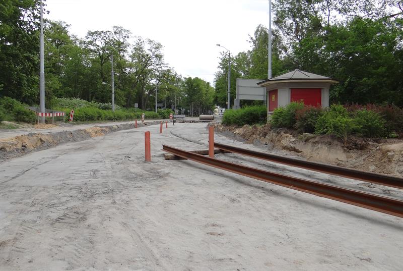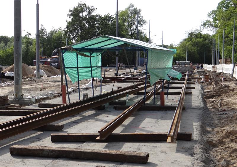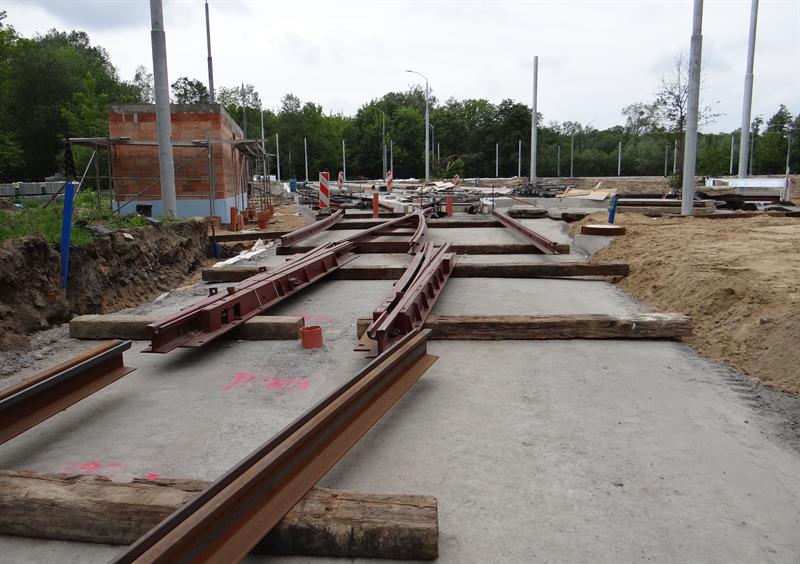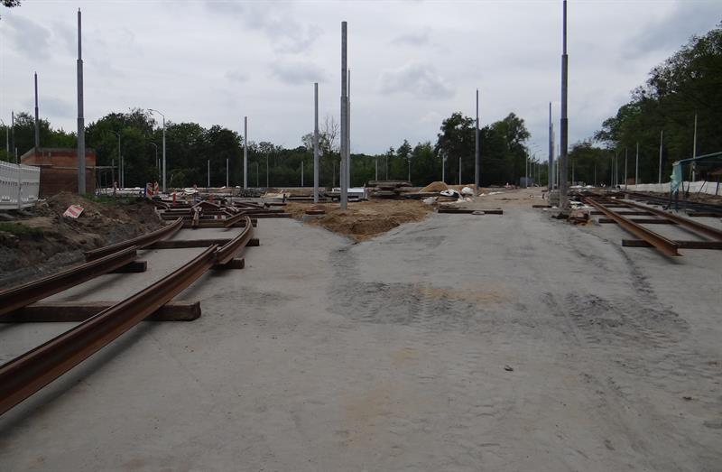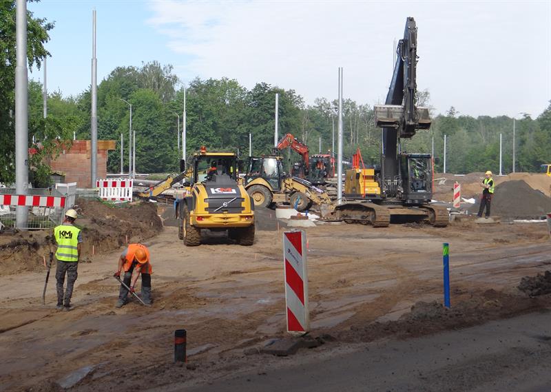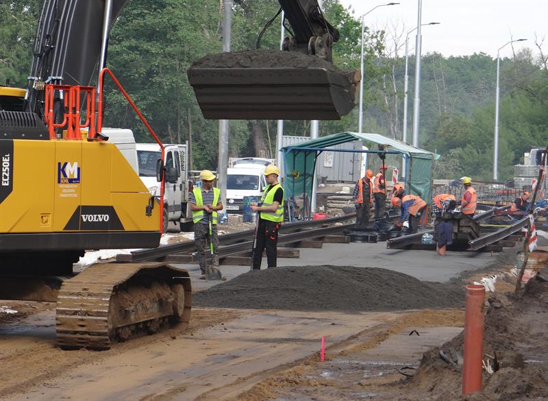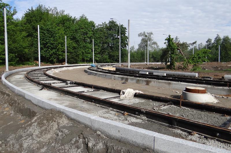 Z gruntu pod częścią wytyczonych na nowo jezdni i torowiska najpierw trzeba było usunąć stare instalacje, w tym spory fragment solidnego, ze zbrojonego betonu kanału kanalizacji sanitarnej. By wydobyć trzeba było go kruszyć przy użyciu młotów pneumatycznych. Następnie całe podłoże zostało wyłożone warstwą materaców komórkowych przed nawiezieniem materiałów do podsypki i niwelacją terenu. Taka warstwa to w tym rejonie integralna część betonowej podbudowy jezdni wraz z torowiskiem, jak też pod torami w obrębie samej pętli.W minionych tygodniach ustawione zostały tam również słupy sieci trakcyjnej i słupy latarni.