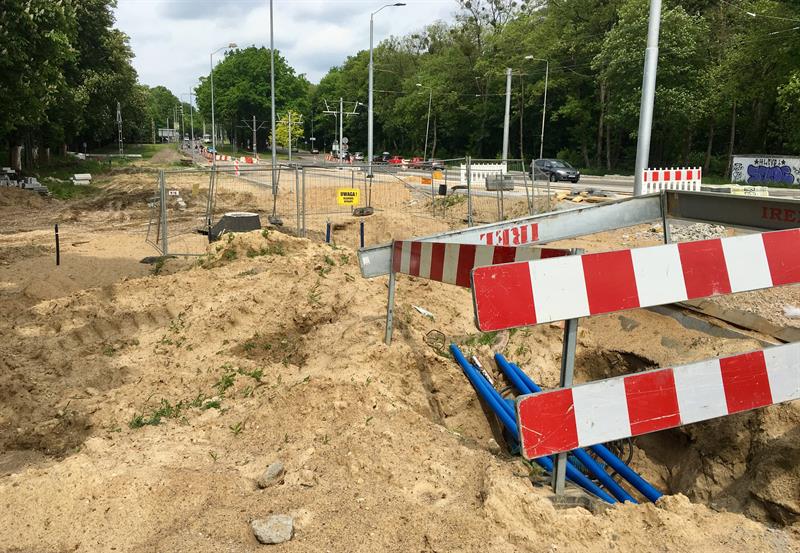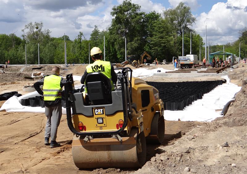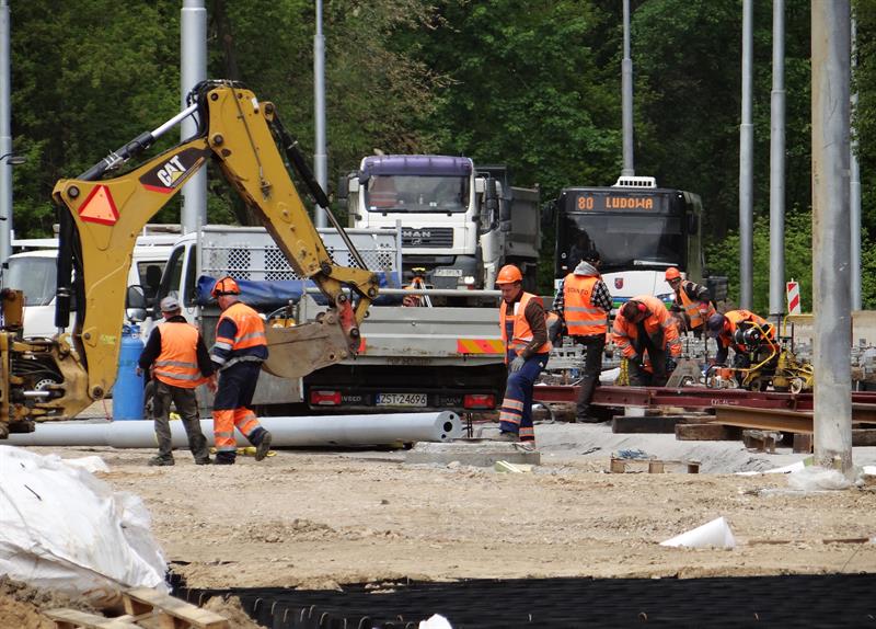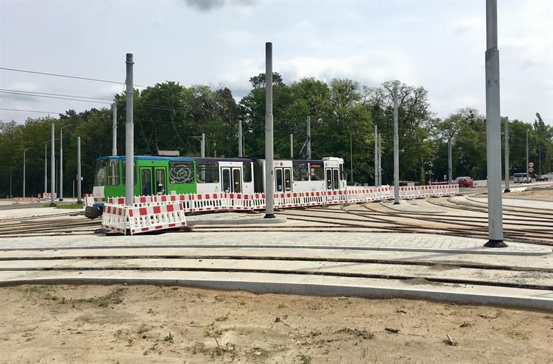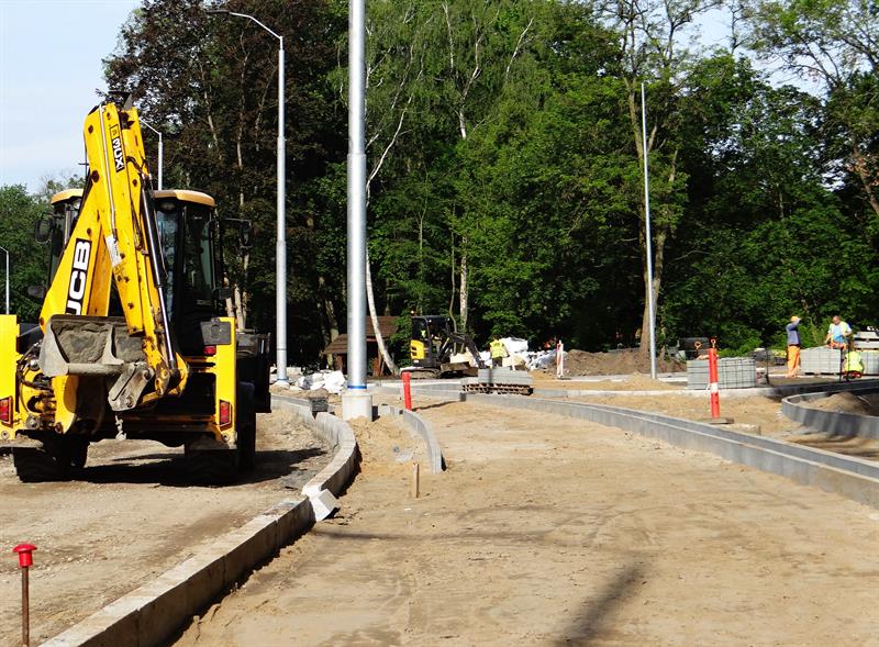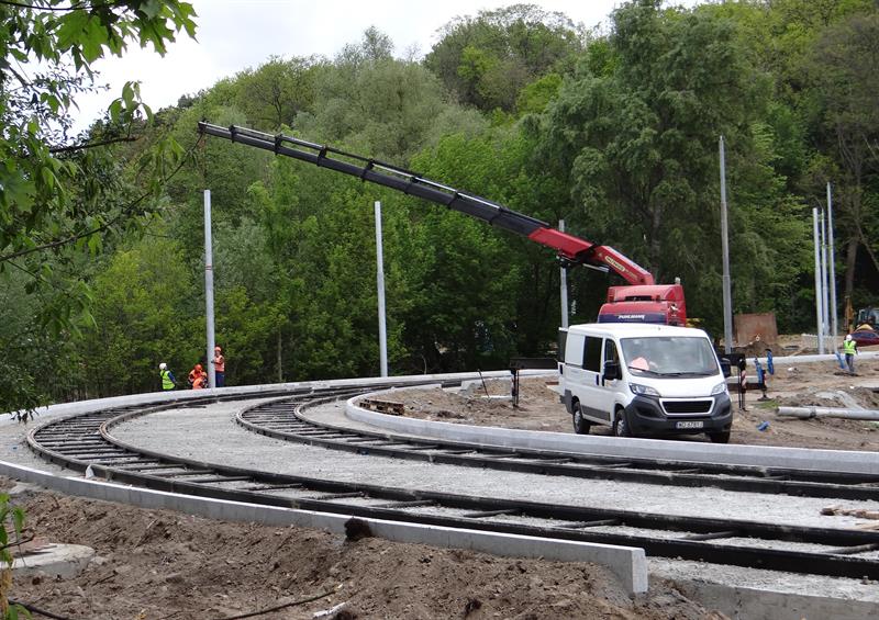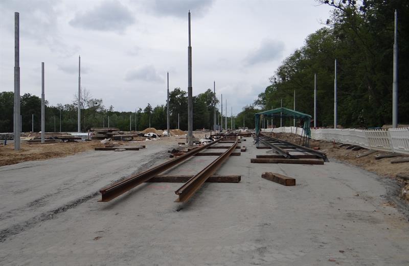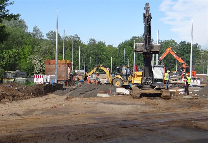Z gruntu pod częścią wytyczonych na nowo jezdni i torowiska najpierw trzeba było usunąć stare instalacje, w tym spory fragment solidnego, ze zbrojonego betonu kanału kanalizacji sanitarnej. By wydobyć trzeba było go kruszyć przy użyciu młotów pneumatycznych. Następnie całe podłoże zostało wyłożone warstwą materaców komórkowych przed nawiezieniem materiałów do podsypki i niwelacją terenu. Taka warstwa to w tym rejonie integralna część betonowej podbudowy jezdni wraz z torowiskiem, jak też pod torami w obrębie samej pętli.W minionych tygodniach ustawione zostały tam również słupy sieci trakcyjnej i słupy latarni.