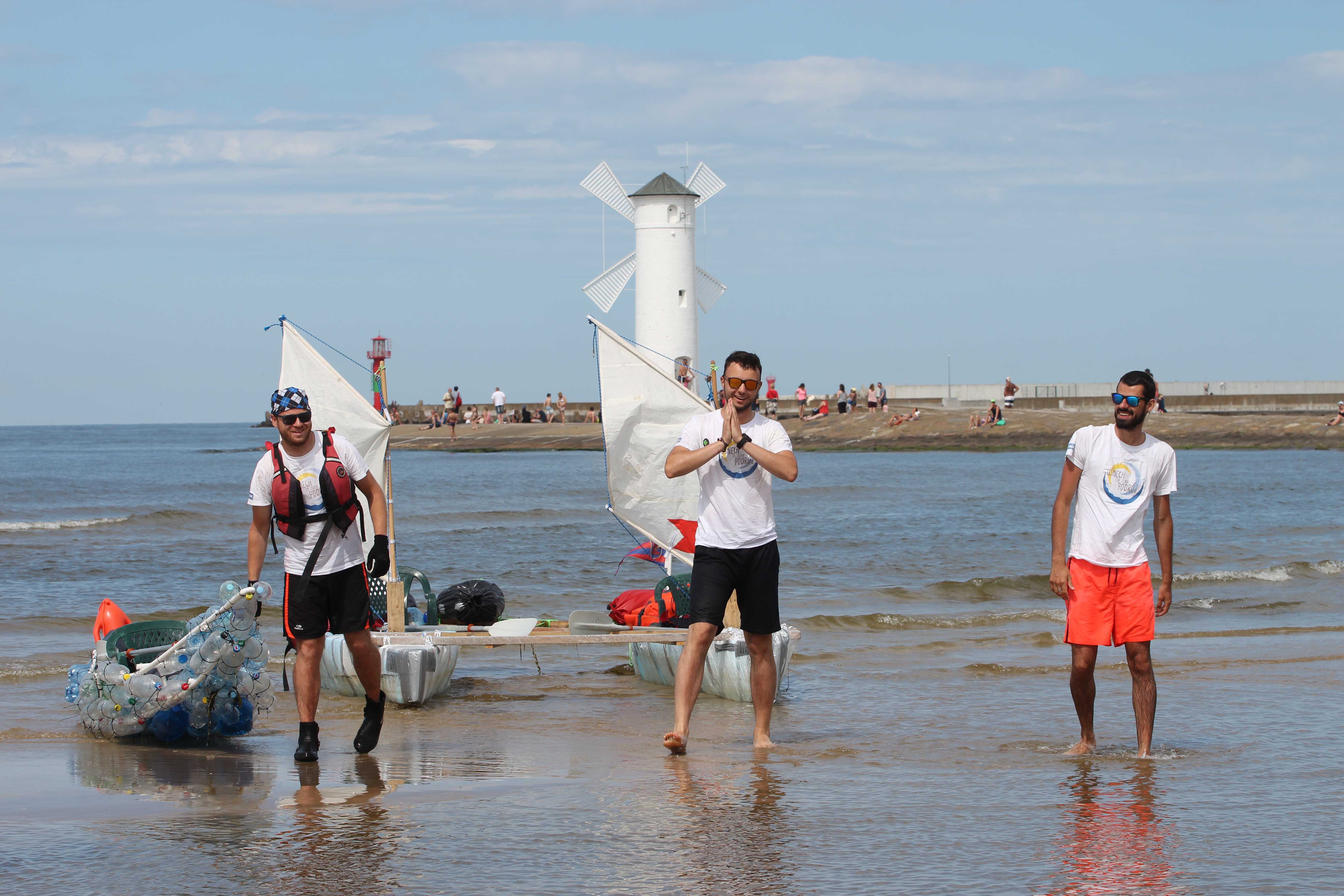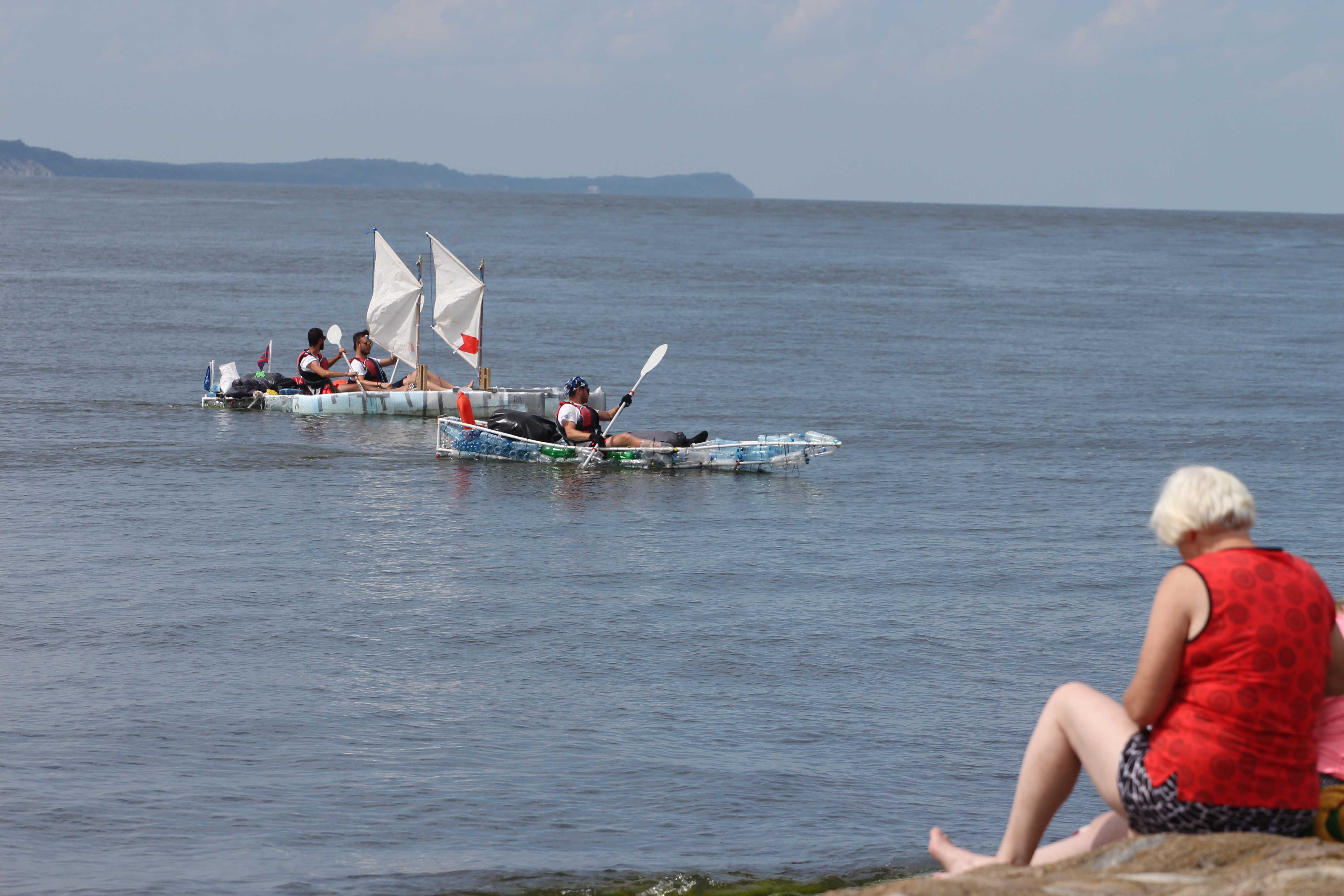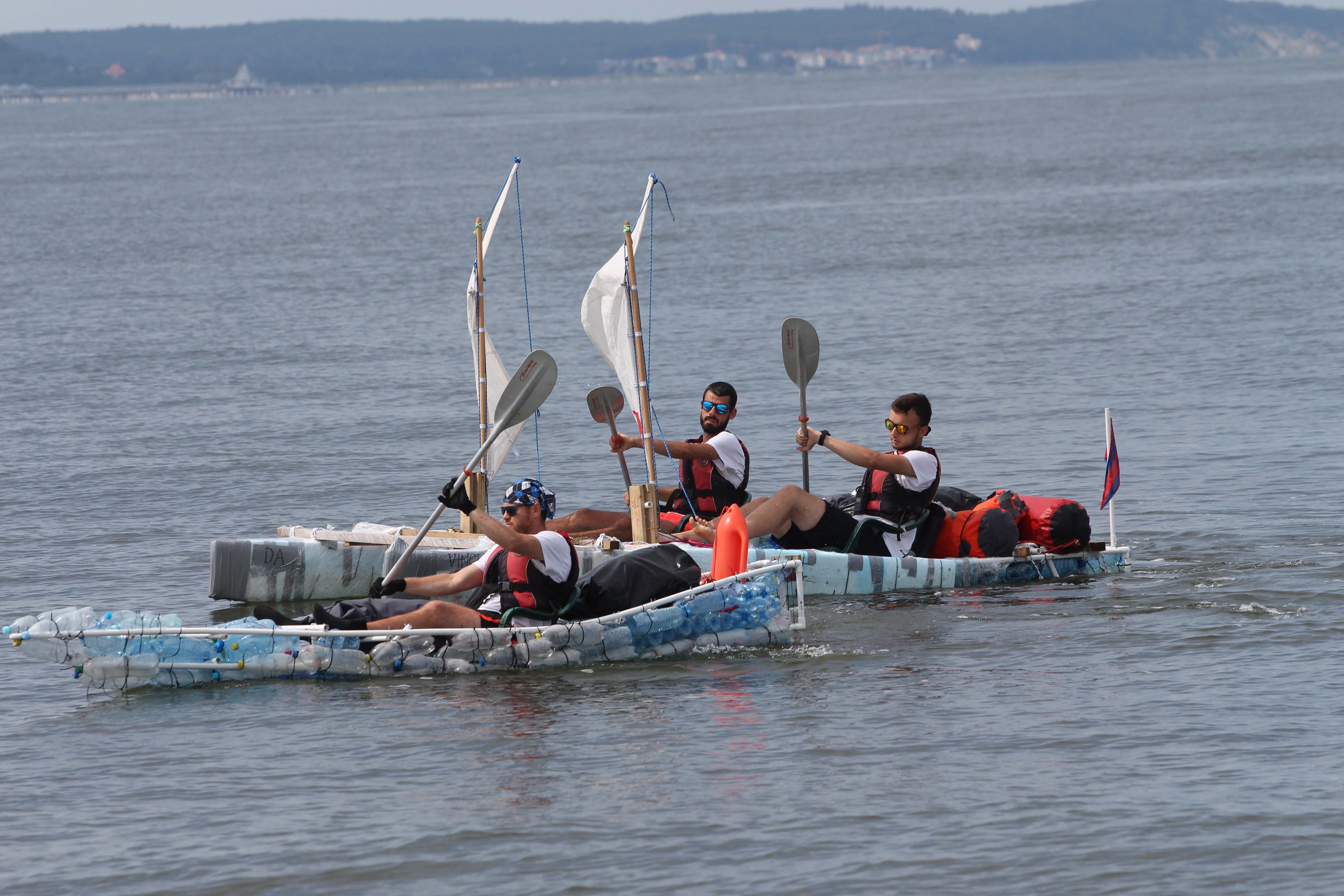 Na zdjęciu: Trzech przyjaciół postanowiło pomóc swojemu choremu koledze i wyruszyło ze Szczecina do Świnoujścia na nietypowych jednostkach pływających, katamaranie oraz kajaku, wybudowanych z butelek PET i rurach PCV. Wodna wyprawa trwałą pięć dni.