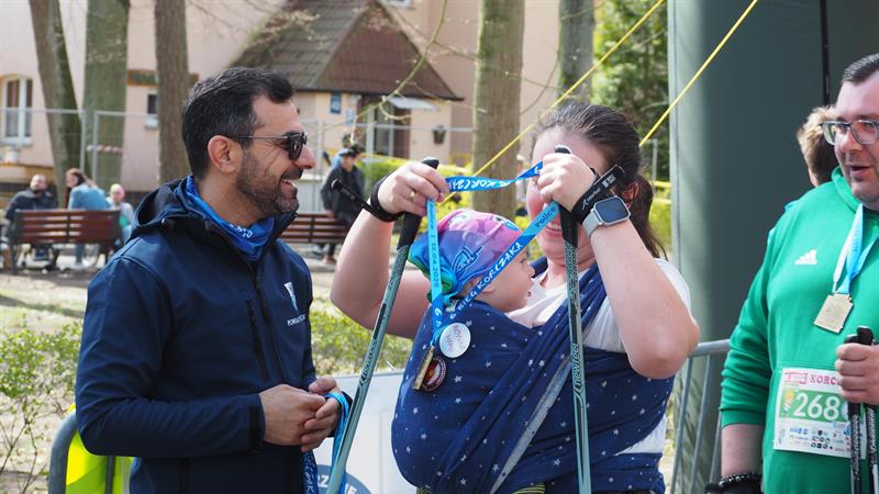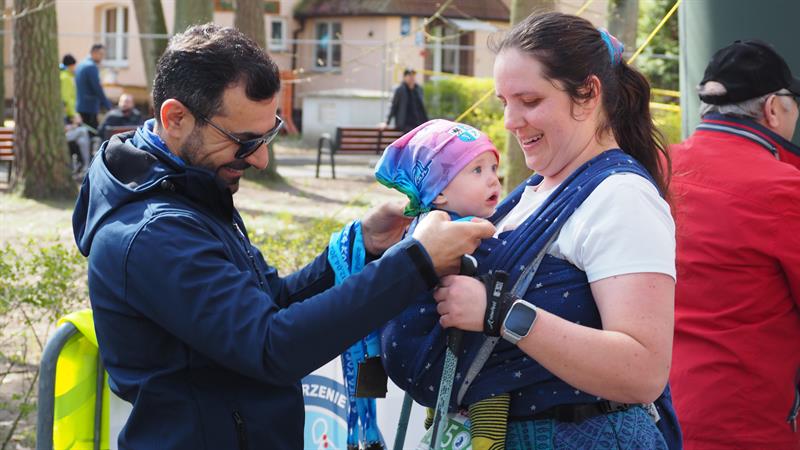 Z uśmiechem, z 10-miesięcznym synkiem – można powiedzieć w ramionach – pokonała całą 5-kilometrową trasę. I to w całkiem dobrym tempie. Jak się okazało, to nie był pierwszy występ Radomira na zawodach.