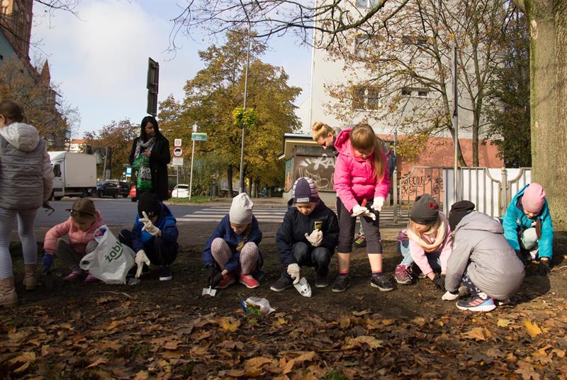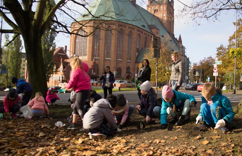 Przedszkolaki oraz uczniowie wszystkich klas Szkoły Podstawowej nr 63 z Oddziałami Integracyjnymi w Szczecinie przy ul. Grodzkiej wraz ze swoimi wychowawcami sadzili w piątek (18 października) przed szkołą kwiaty. Już wiosną ich krokusy, tulipany, hiacynty i narcyzy będą cieszyć dzieci, nauczycieli i mieszkańców Starego Miasta.
