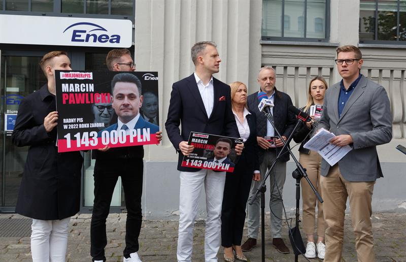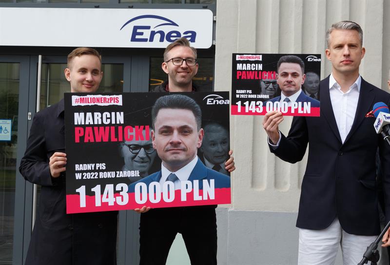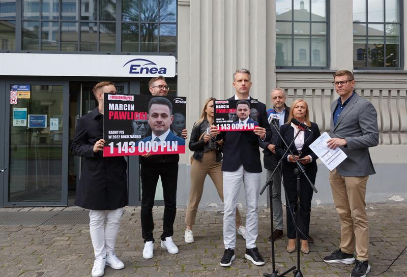 Wchodzącym do budynku Enei wręczano w tym czasie ulotki, na których widoczna była podobizna Marcina Pawlickiego oraz w tle premiera Morawieckiego i prezesa Kaczyńskiego stojącego na czele Prawa i Sprawiedliwości, partii na rzecz której w grudniu zeszłego roku Marcin Pawlicki dokonał darowizny w wysokości 42 450,00 złotych.