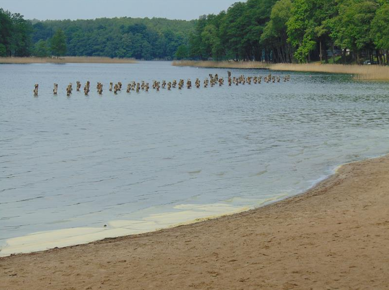 Ten kto rozbierał ten pomost powinien bardziej myśleć. To jest strzeżona plaża i ludzie tam pływają, chodzą.Część pomostu która była zadaszona została rozebrana ale cały dach tej części leży pod wodą. Tam leżą deski z wystającymi gwoździami nie polecam być przy prawej stronie plaży. Polecam iść na środek plaży i tam korzystać. Jest płytko i nie ma tam części pomostu.