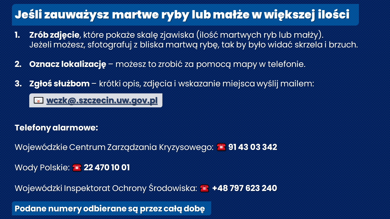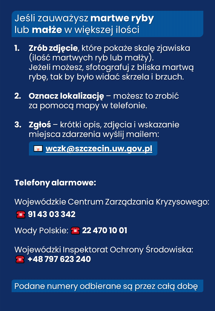 Aby służby mogły właściwie i szybko reagować, niezbędne jest wsparcie społeczne. Służby wojewody apelują: „Zrób zdjęcie, które pokaże skalę zjawiska. Jeżeli możesz, sfotografuj z bliska martwą rybę tak, aby było widać skrzela i brzuch. Oznacz lokalizację - można to zrobić za pomocą mapy w telefonie. Zgłoś - krótki opis, zdjęcia i wskazane miejsce zdarzenia wyślij mailem na adres: wczk@szczecin.uw.gov.pl". Informacje o zauważonych martwych rybach lub małżach w większej ilości należy można również przekazywać telefonicznie do: Wojewódzkiego Centrum Zarządzania Kryzysowego (tel. 91 43 03 342), Wojewódzkiego Inspektoratu Ochrony Środowiska (+48 797 623 240) oraz Wód Polskich (22 470 10 01). Wskazane numery są czynne całodobowo, przez siedem dni w tygodniu. Każde ze zgłoszeń jest i będzie weryfikowane na bieżąco - jak zapewniali przedstawiciele służb podległych wojewodzie, podczas poniedziałkowej (24 czerwca) konferencji prasowej.