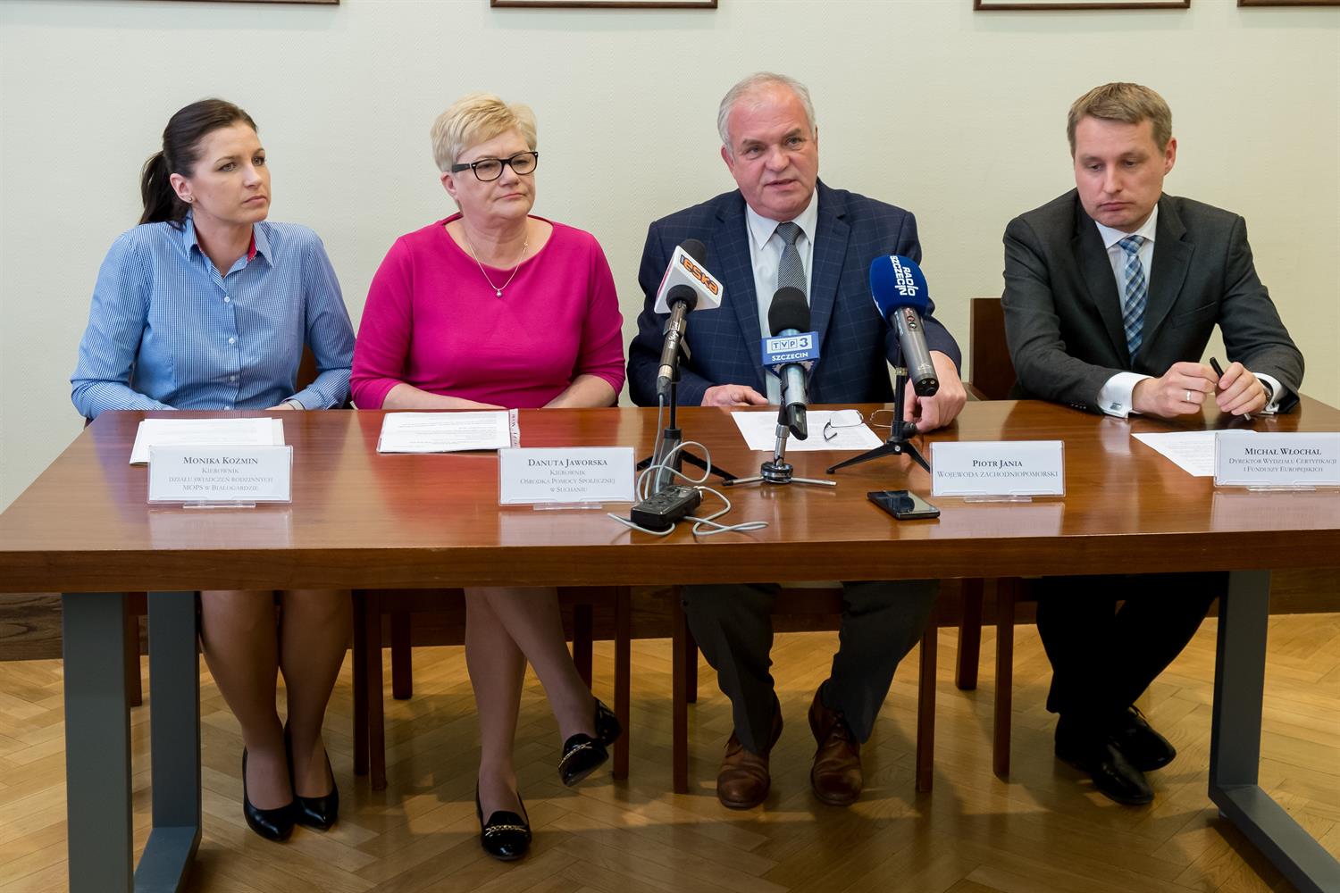 Na zdjęciu: Po miesiącu czas na wstępne podsumowanie. Na zdjęciu (od lewej) Monika Koźmin (MOPS w Białogardzie), Danuta Jaworska (OPS w Suchaniu), wojewoda Piotr Jania oraz Michał Włochal (z Zachodniopomorskiego Urzędu Wojewódzkiego).