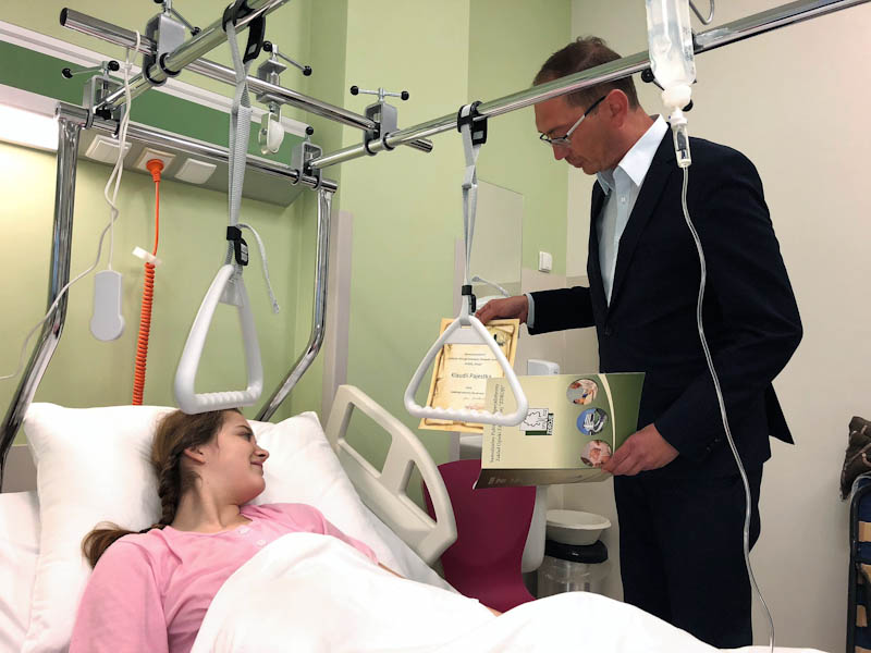 Pacjentkę odwiedził Łukasz Tyszler, dyrektor szpitala, wręczając jej prezent oraz dyplom upamiętniający fakt, że była pionierem nowego oddziału.