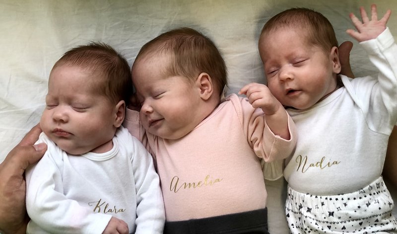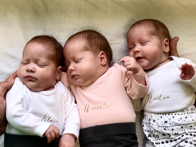 Dzieci przyszły na świat 2 maja, w 29. tygodniu ciąży. Pomimo stosunkowo niskiego wieku ciążowego neonatolodzy określili ich stan jako dobry, wszystkie otrzymały po 7 i 8 punktów w skali Apgar. Pierwsza urodziła się Klara z masą urodzeniową 1,25 kg, później Amelia, (1,4 kg), a ostatnia Nadia (1,2 kg).