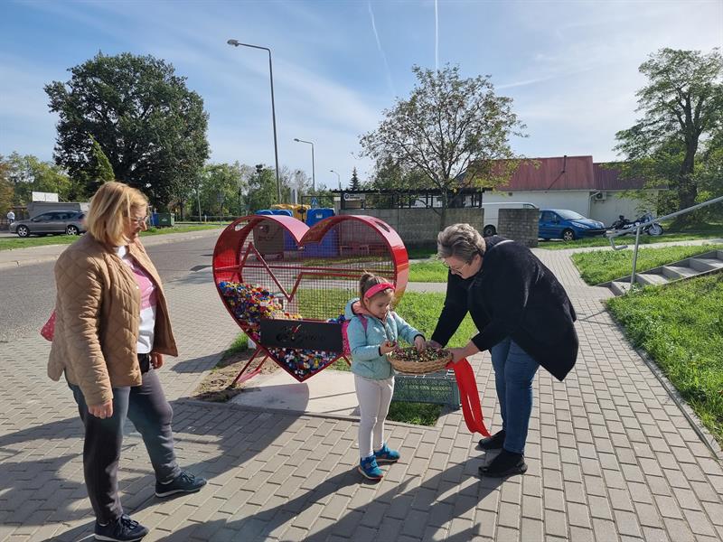 Pierwsze w Szczecinie „Serce dla Zwierząt" - otwarte na pomaganie w piątkowe południe - powoli zapełnia się nakrętkami. Darczyńcy docierają do ustawionej przy ul. Foczej (Kijewo) instalacji z workami darów.