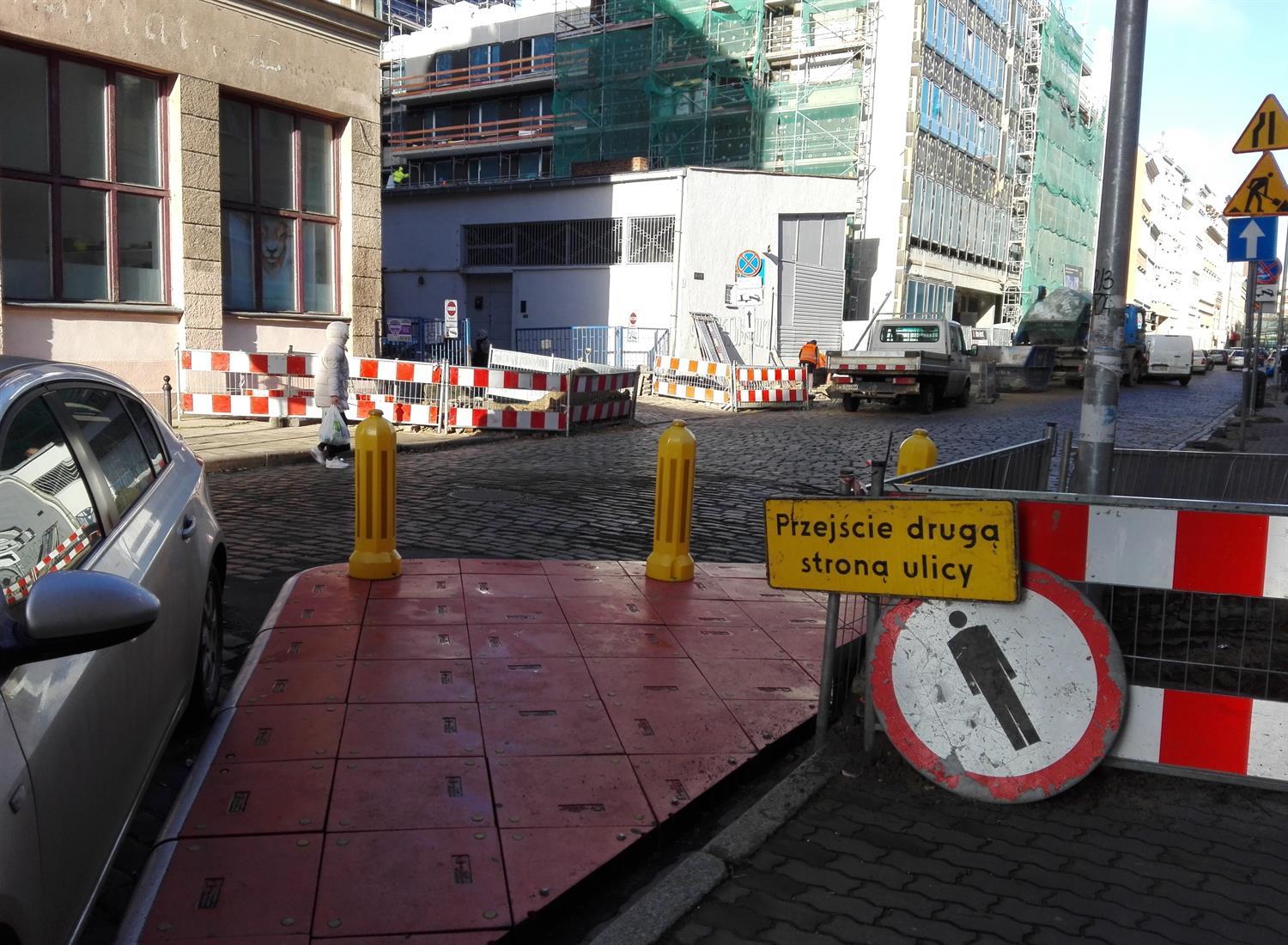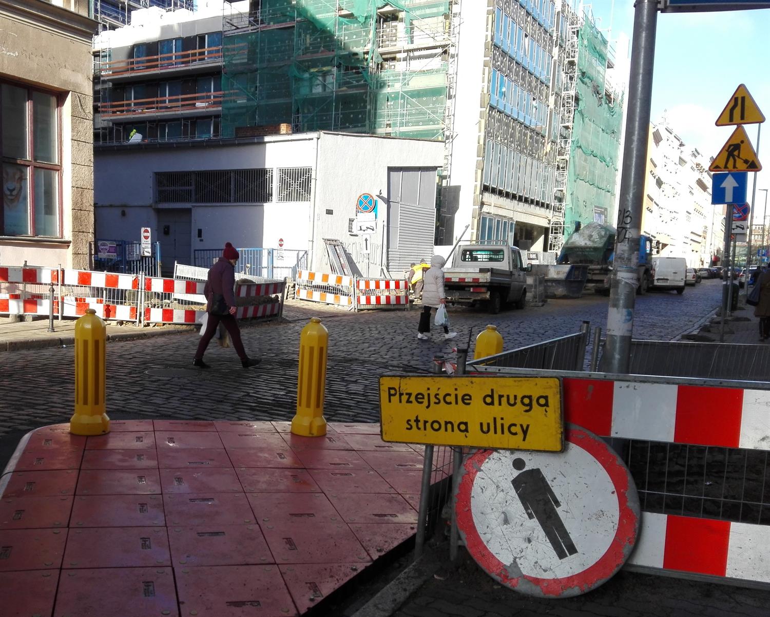 Został rozkopany chodnik u zbiegu ul. Tkackiej i Łaziebnej. Piesi są kierowani - jak widać na zdjęciu - do przejścia na drugą stronę ulicy. „Czyli gdzie?" - pyta nasza Czytelniczka. Prowadzący i nadzorujący inwestycję, a przede wszystkim urzędnicy Zarządu Dróg i Transportu Miejskiego, którzy zezwolili na zajęcie chodnika w tym miejscu, najwyraźniej odpowiadają szczecinianom: „gdzieś". Skoro na wskazanej - przeciwległej stronie ul. Tkackiej - trotuar już w ub. roku został pieszym odebrany i zaanektowany pod zaplecze budowy „Czarnej Perły".