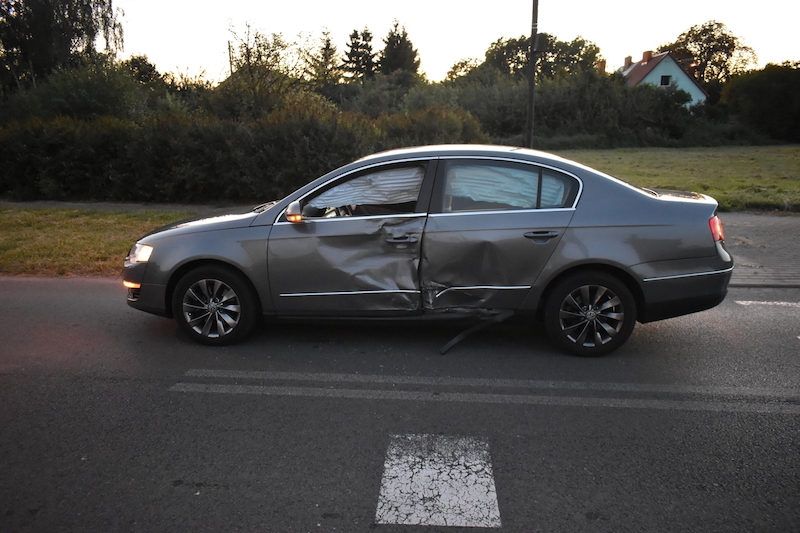 Jak ustalili policjanci kierujący quadem wjeżdżając na skrzyżowanie nie ustąpił pierwszeństwa prawidłowo jadącemu kierowcy volkswagena. W efekcie uderzył w lewy bok pojazdu. Kierowca czterokołowca wraz z pasażerem spadli z pojazdu, ale po chwili usiedli ponownie i próbowali odjechać. Po kilku metrach wjechali w ogrodzenie pobliskiej posesji, gdyż w quadzie urwało się jedno z kół.