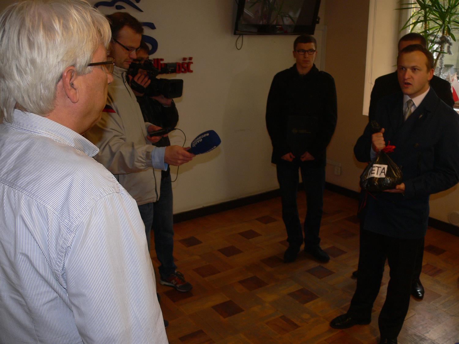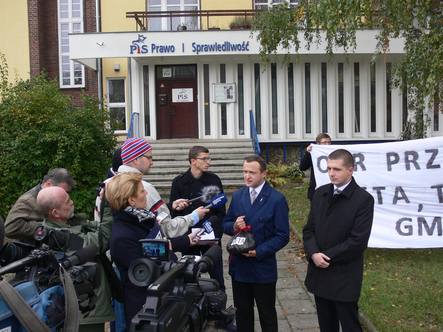 Następnie pikietujący weszli do siedziby PiS i wręczyli sekretarzowi Witoldowi Witkowskiemu czarny woreczek z owymi zgniłymi owocami. - Przecież jeszcze w sprawie tych umów nic nie jest przesądzone - uspokajał Witkowski.