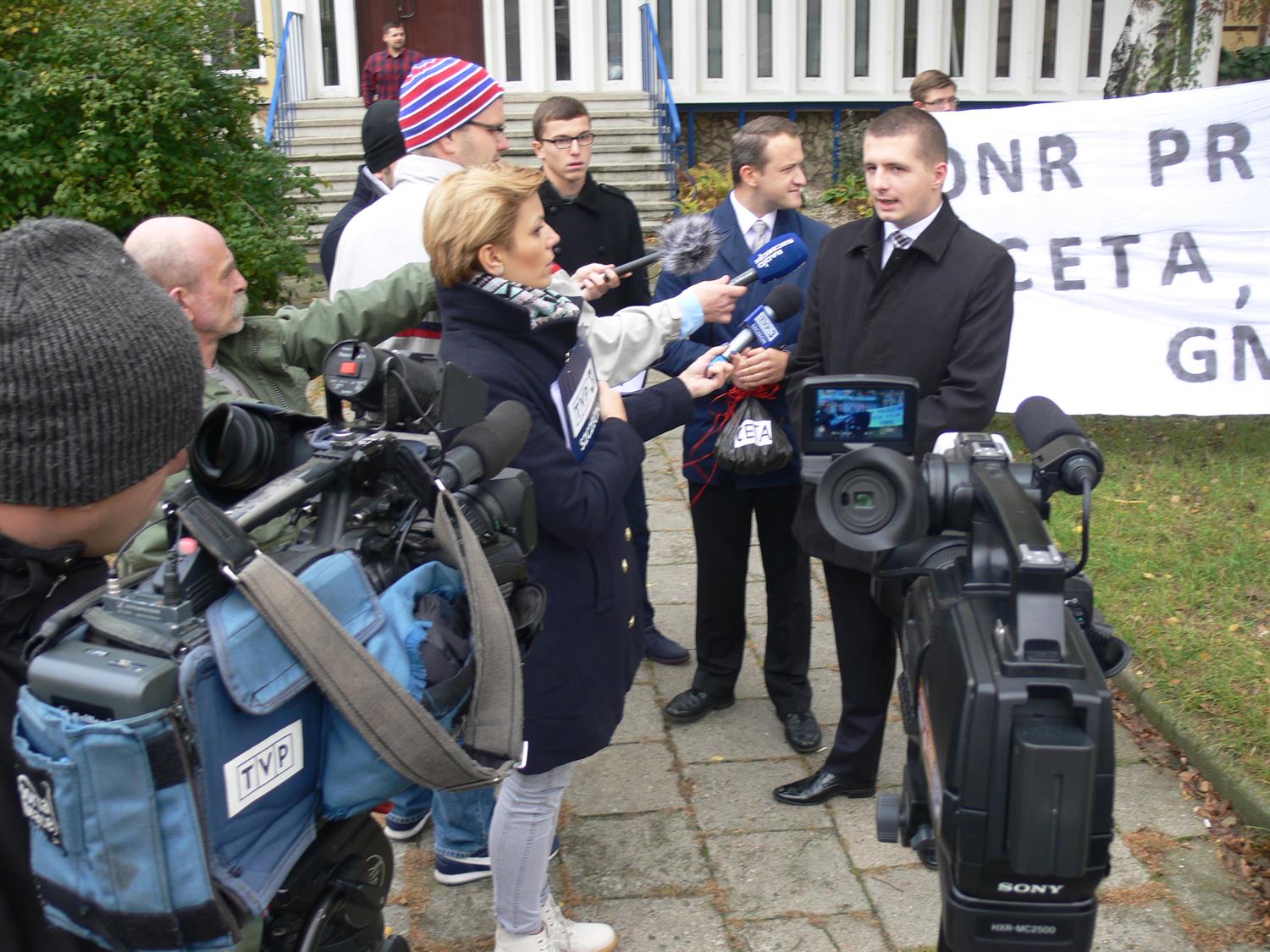 - Sprzeciwiamy się tzw. umowie o wolnym handlu z USA i Kanadą. Chcemy przekazać partii rządzącej worek zepsutych owoców. Tak samo zepsutych jak żywność, która przybędzie do nas w momencie, kiedy ratyfikujemy te umowy - powiedział Krzysztof Rudzki z Młodzieży Wszechpolskiej.