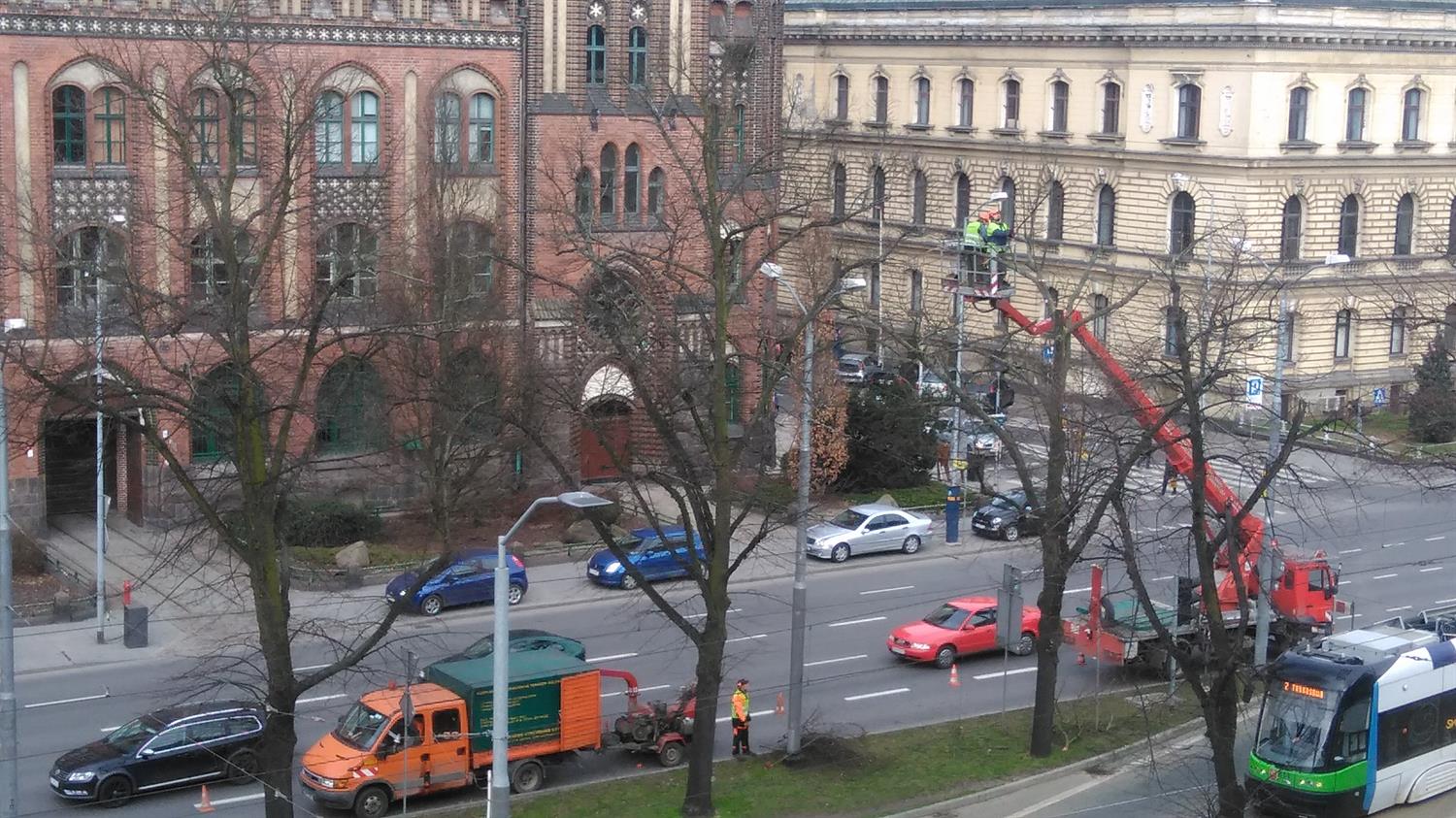 Na szczycie lipy w al. Niepodległości w Szczecinie ptaki uwiły okazałe gniazdo. Od 1 marca trwa ich okres lęgowy. Prawo je bierze w ochronę, zakazując niszczenia gniazd oraz siedlisk, nawet płoszenia. Tyle w teorii, bo w praktyce… Jak widać na zdjęciu - nawet za dnia i w centrum Szczecina (czwartek - 16 marca) - można odpalić piły i ciąć gałęzie oraz konary z pnia sąsiadującego z zajętym gniazdem. I zrzucać je z drzewa wysokiego na sześć pięter na ziemię. Z rozmachem, a w sąsiedztwie nie tylko ptasiego domu, ale też trakcji tramwajowej i pięciu pasów ruchu arterii o sporym natężeniu ruchu. Bo… przecież pilarzom nie zabroni nikt?!