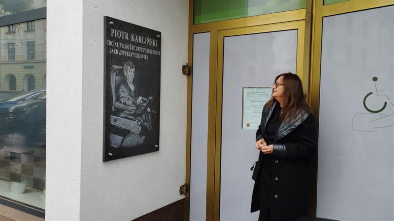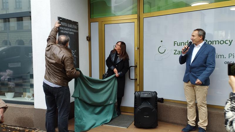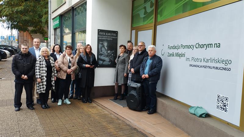A tuż przed konferencją przed siedzibą Fundacji Pomocy Chorym na Zanik Mięśni im. Piotra Karlińskiego w Szczecinie odsłonięto tablicę pamiątkową ku pamięci jej patrona.