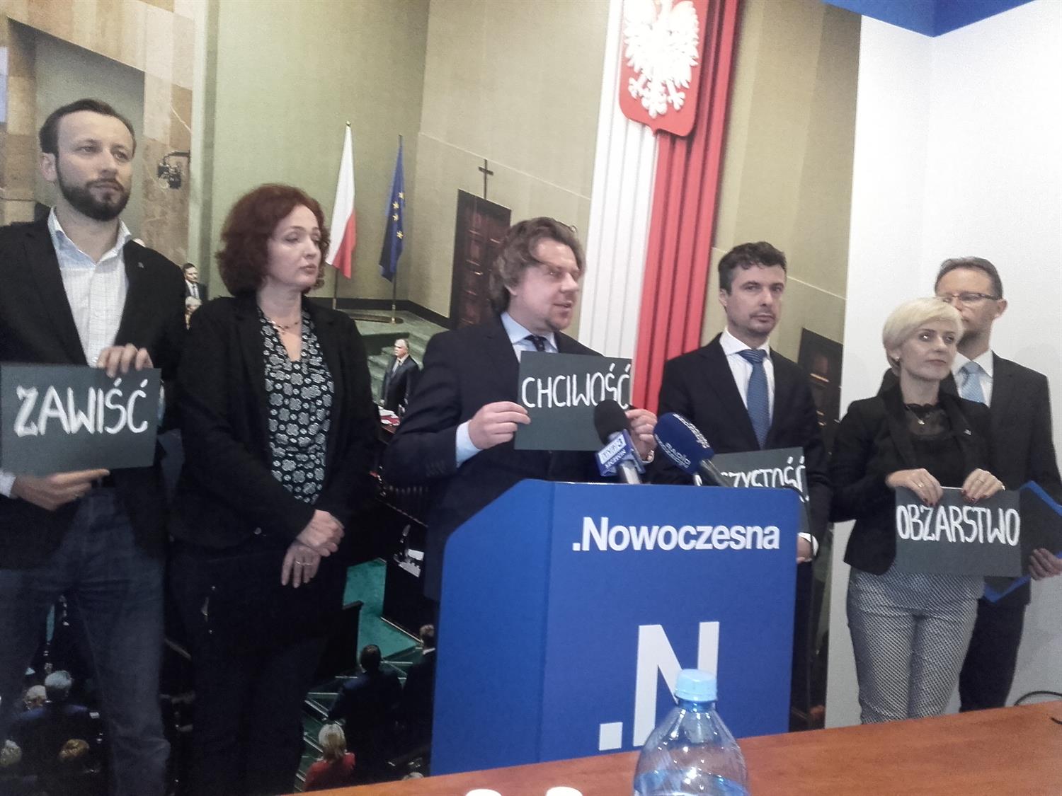 Politycy Nowoczesnej zwołali w poniedziałek konferencję prasową. Uzbrojeni w czarne kartki z białymi napisami (jedna kartka - jeden grzech główny) skrytykowali rządy PiS. Właśnie mija rok od wygranych przez partię Jarosława Kaczyńskiego wyborów parlamentarnych.