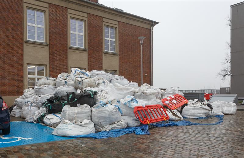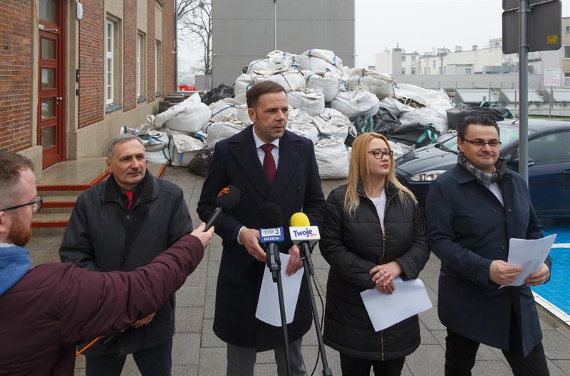 Przedstawiciele prawicy zorganizowali czwartkową konferencję prasową przed nową siedzibą Teatru Polskiego. Chcieli pokazać dziennikarzom stertę worków z gruzem, która stoi obok budynku. Jak opowiadali, worki znajdują się tu od czasu, gdy w sierpniu ub. roku teatr został zalany podczas ulewy.