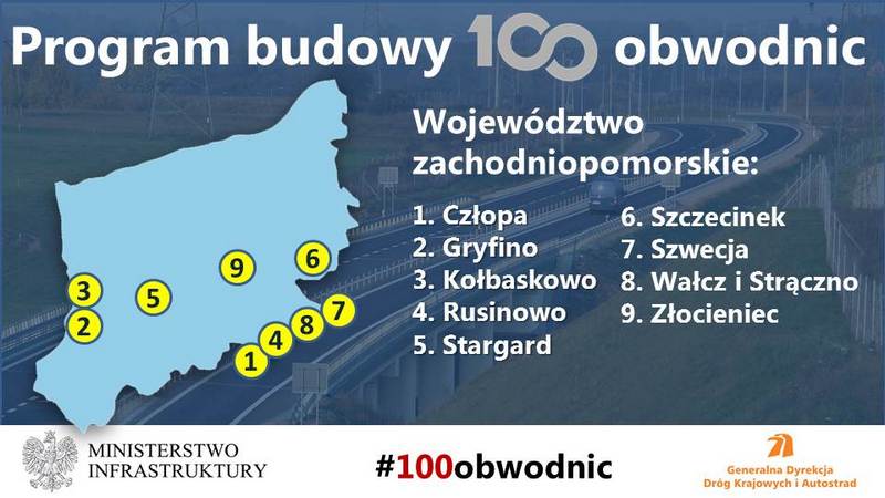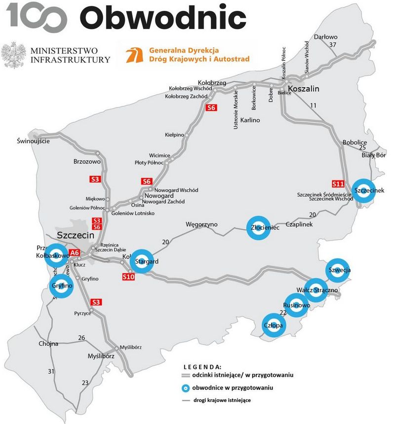 Obwodnice mają powstać w miejscach takich jak: Człopa, Gryfino, Kołbaskowo, Rusinowo, Stargard, Szczecinek, Szwecja, Wałcz i Strączno, Złocieniec.
